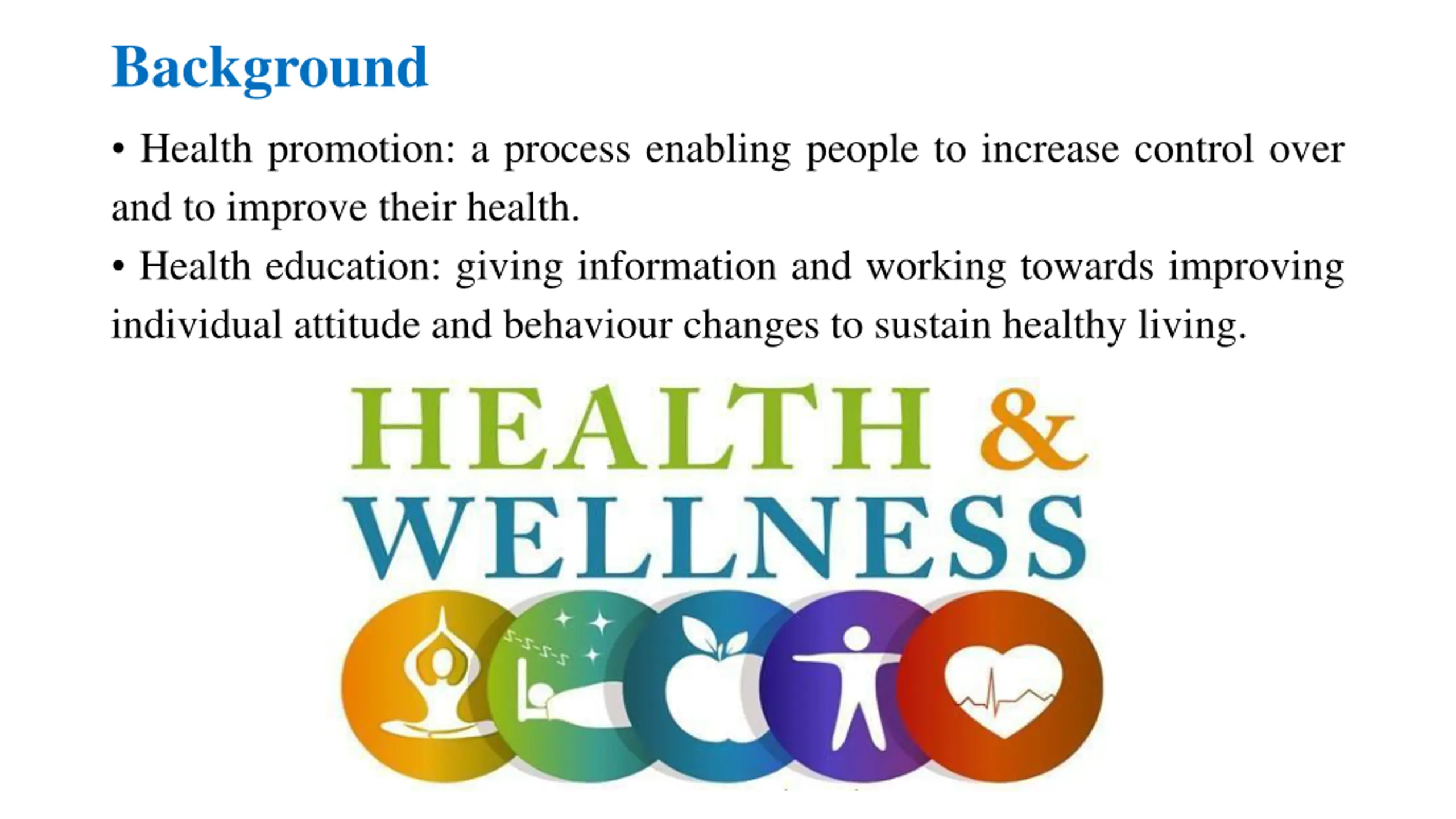 Background Health promotion: a process enabling people to increase control over and to improve their health. Health education: giving information and working towards improving individual attitude and behaviour changes to sustain healthy living.