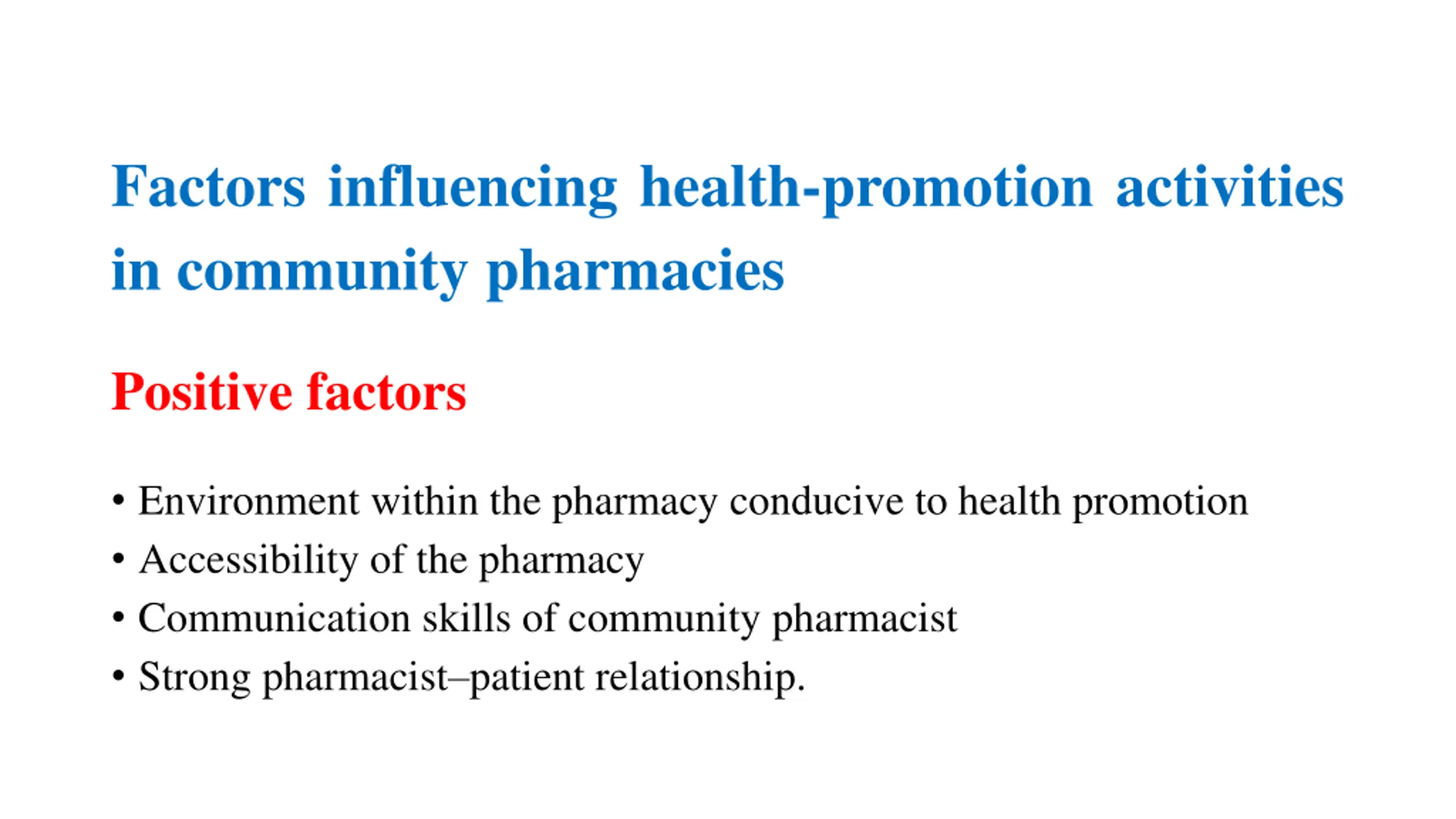 Factors influencing health-promotion activities in community pharmacies Positive factors Environment within the pharmacy conducive to health promotion Accessibility of the pharmacy Communication skills of community pharmacist Strong pharmacist patient relationship.