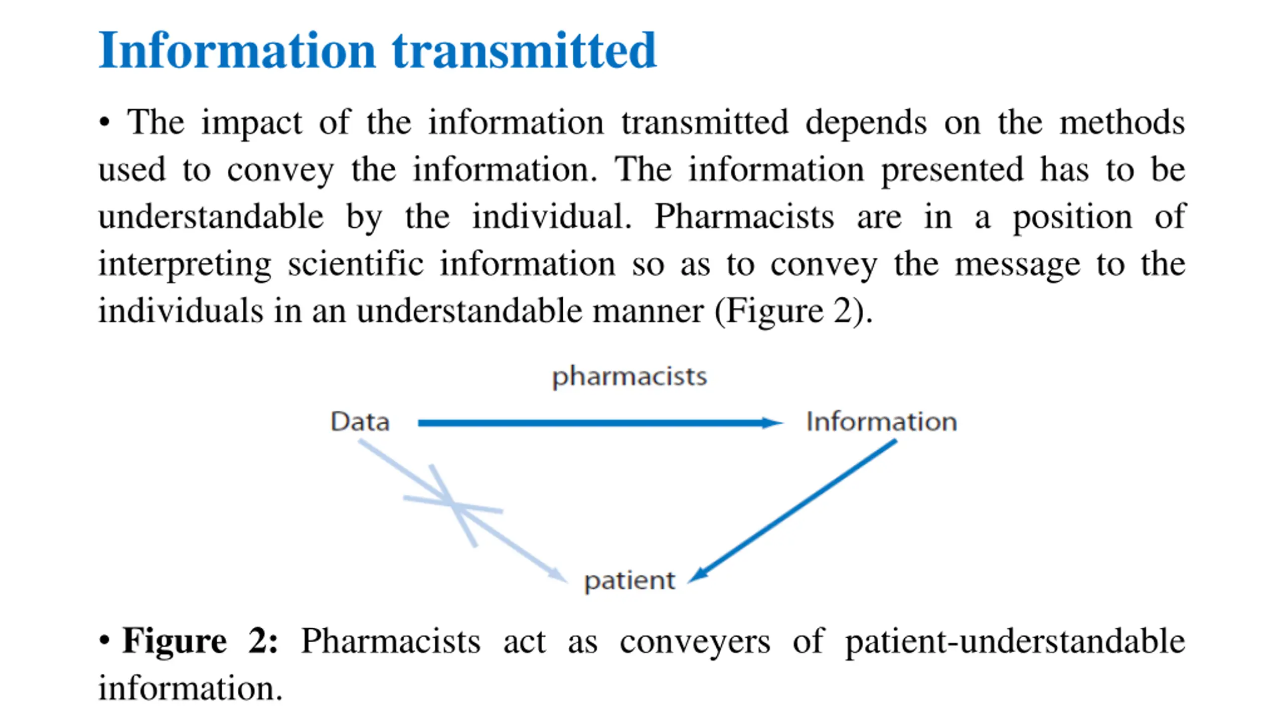 Information transmitted The impact of the information transmitted depends on the methods used to convey the information. The information presented has to be understandable by the individual. Pharmacists are in a position of interpreting scientific information so as to convey the message to the individuals in an understandable manner (Figure 2). Figure 2: Pharmacists act as conveyers of patient-understandable information.