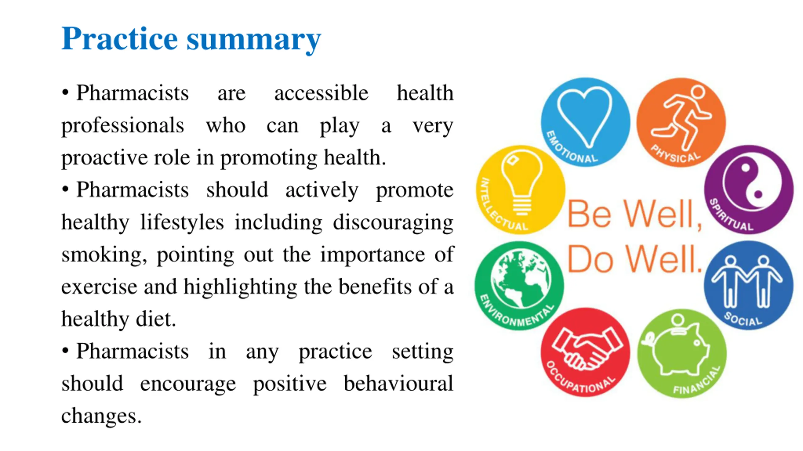 Practice summary Pharmacists professionals who can play a very proactive role in promoting health. Pharmacists should actively promote healthy lifestyles including discouraging smoking, pointing out the importance of exercise and highlighting the benefits of a healthy diet. Pharmacists in any practice setting should encourage positive behavioural changes. are accessible health