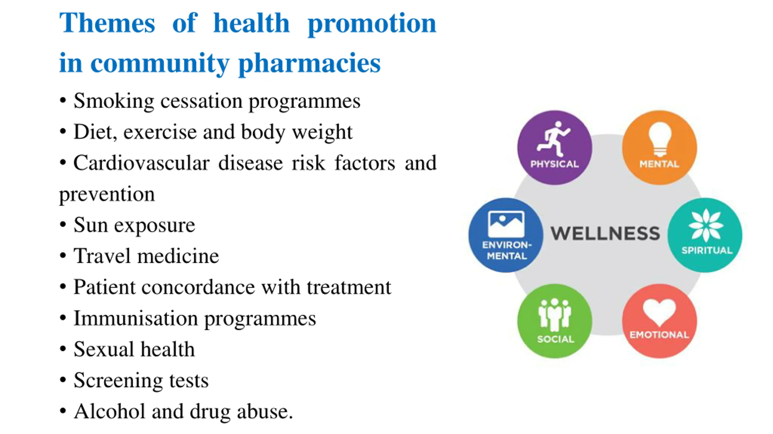 Themes of health promotion in community pharmacies Smoking cessation programmes Diet, exercise and body weight Cardiovascular disease risk factors and prevention Sun exposure Travel medicine Patient concordance with treatment Immunisation programmes Sexual health Screening tests Alcohol and drug abuse.