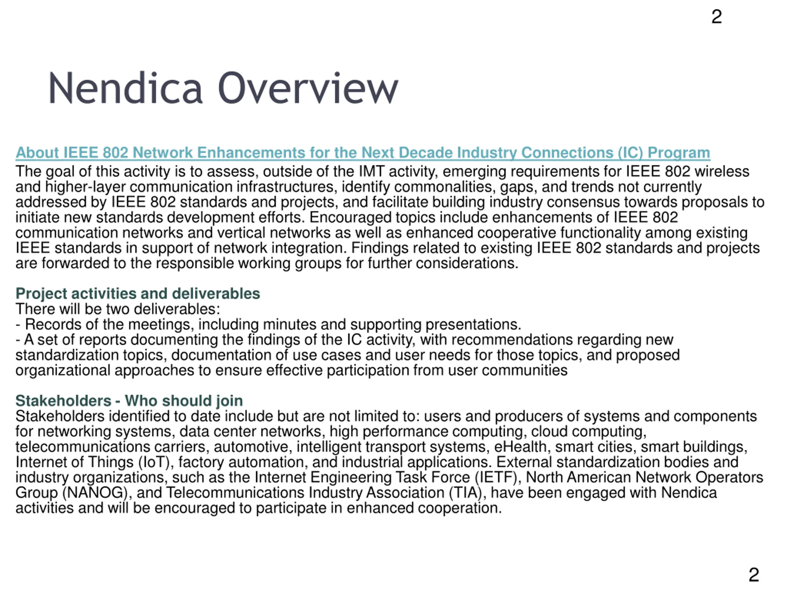 2 Nendica Overview About IEEE 802 Network Enhancements for the Next Decade Industry Connections (IC) Program The goal of this activity is to assess, outside of the IMT activity, emerging requirements for IEEE 802 wireless and higher-layer communication infrastructures, identify commonalities, gaps, and trends not currently addressed by IEEE 802 standards and projects, and facilitate building industry consensus towards proposals to initiate new standards development efforts. Encouraged topics include enhancements of IEEE 802 communication networks and vertical networks as well as enhanced cooperative functionality among existing IEEE standards in support of network integration. Findings related to existing IEEE 802 standards and projects are forwarded to the responsible working groups for further considerations. Project activities and deliverables There will be two deliverables: - Records of the meetings, including minutes and supporting presentations. - A set of reports documenting the findings of the IC activity, with recommendations regarding new standardization topics, documentation of use cases and user needs for those topics, and proposed organizational approaches to ensure effective participation from user communities Stakeholders - Who should join Stakeholders identified to date include but are not limited to: users and producers of systems and components for networking systems, data center networks, high performance computing, cloud computing, telecommunications carriers, automotive, intelligent transport systems, eHealth, smart cities, smart buildings, Internet of Things (IoT), factory automation, and industrial applications. External standardization bodies and industry organizations, such as the Internet Engineering Task Force (IETF), North American Network Operators Group (NANOG), and Telecommunications Industry Association (TIA), have been engaged with Nendica activities and will be encouraged to participate in enhanced cooperation. 2