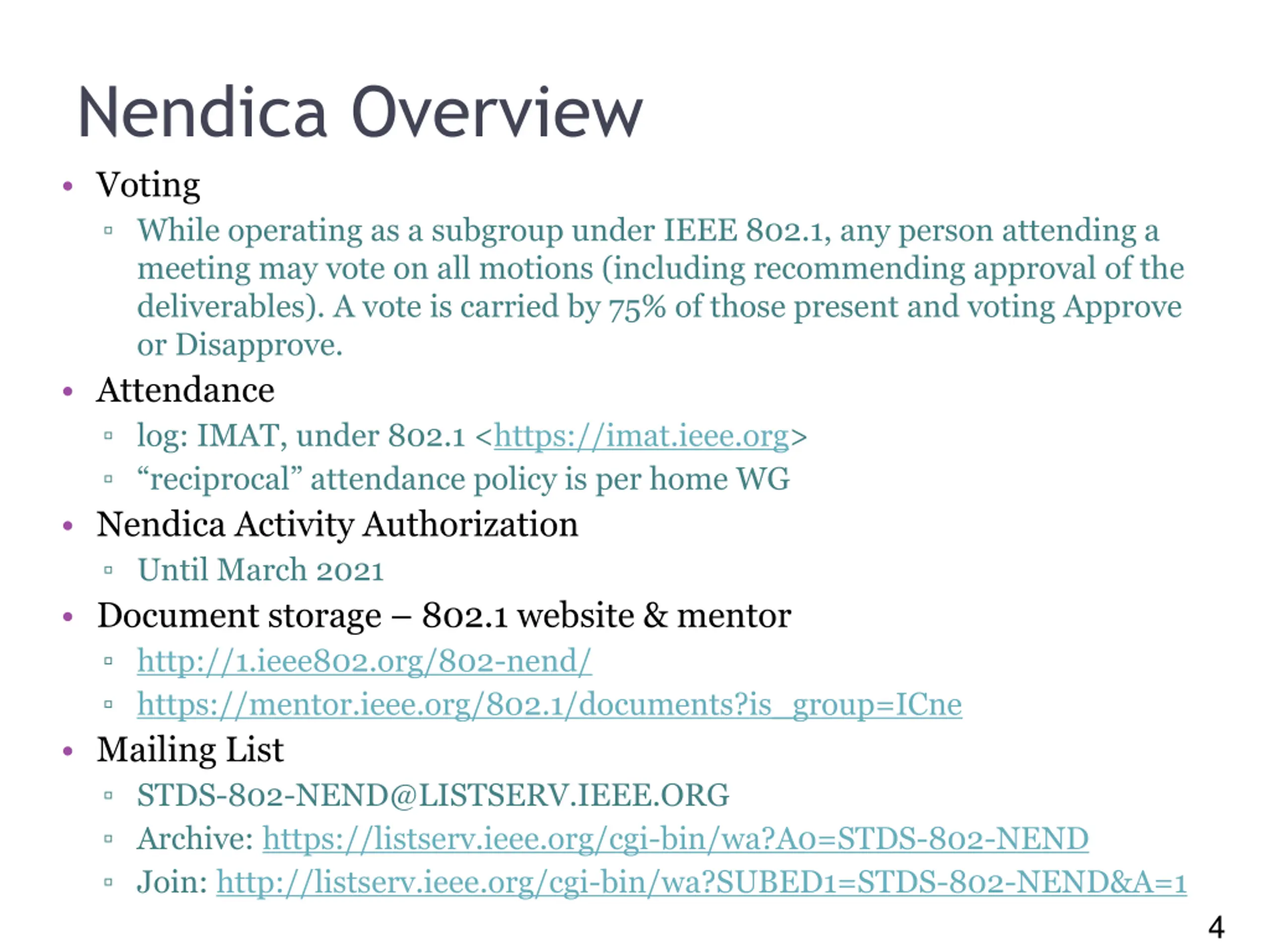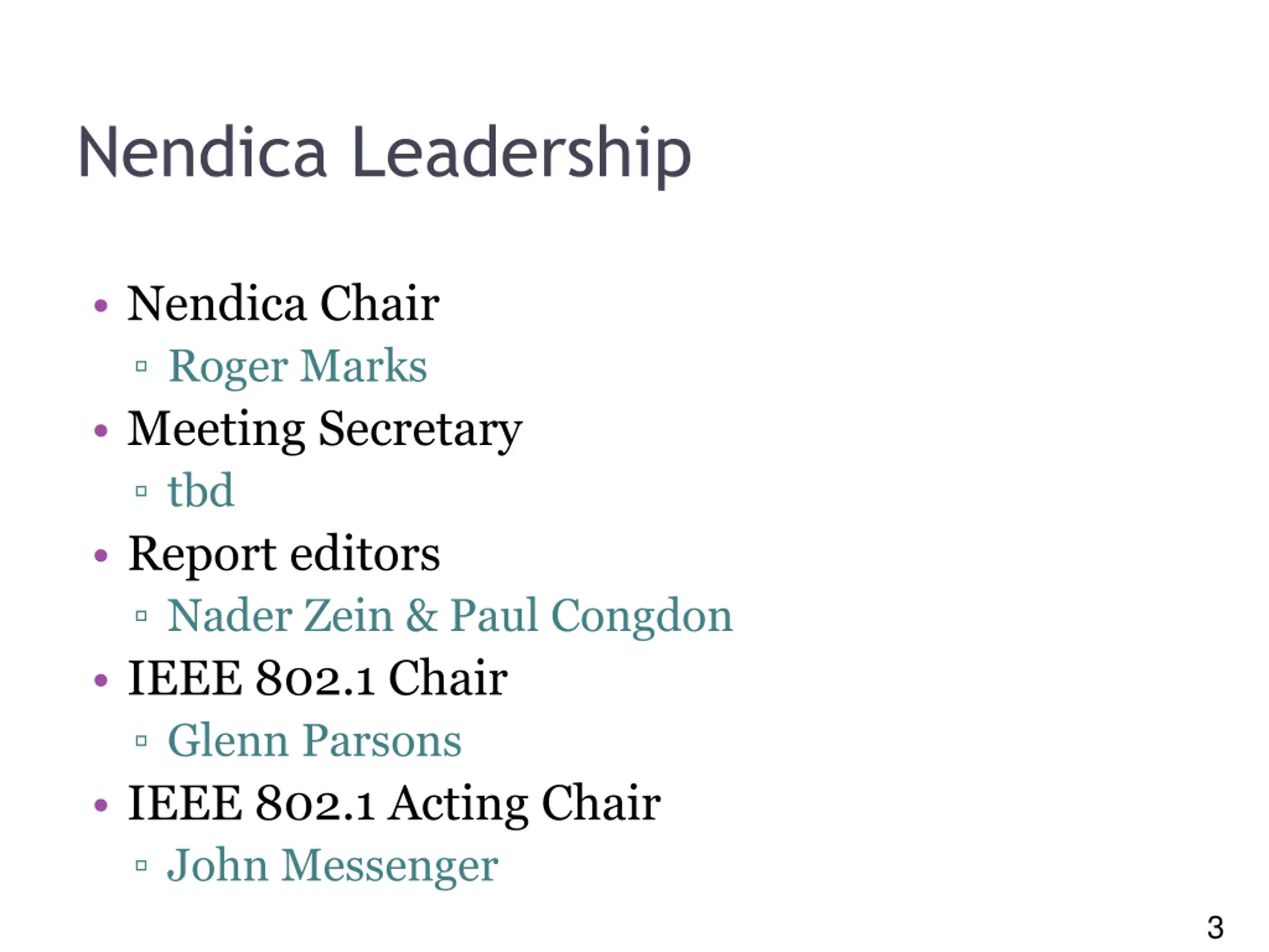 3 Nendica Leadership Nendica Chair Roger Marks Meeting Secretary tbd Report editors Nader Zein & Paul Congdon IEEE 802.1 Chair Glenn Parsons IEEE 802.1 Acting Chair John Messenger 3