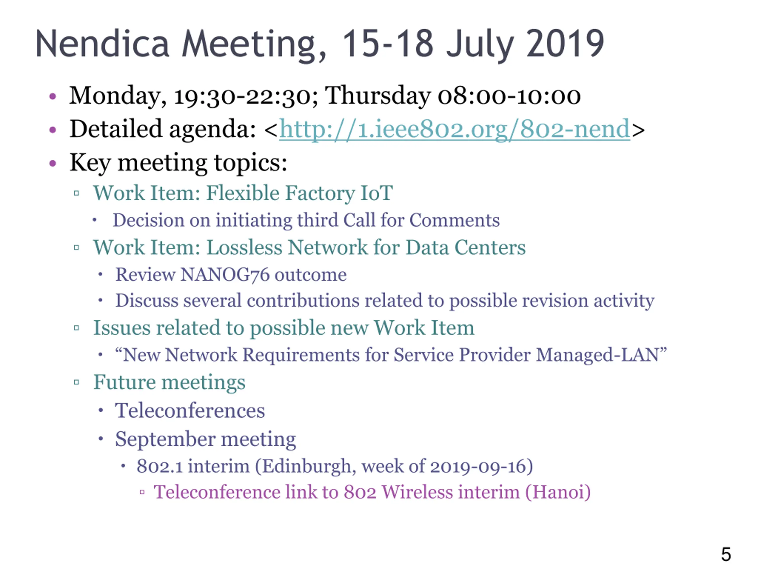5 Nendica Meeting, 15-18 July 2019 Monday, 19:30-22:30; Thursday 08:00-10:00 Detailed agenda: <http://1.ieee802.org/802-nend> Key meeting topics: Work Item: Flexible Factory IoT Decision on initiating third Call for Comments Work Item: Lossless Network for Data Centers Review NANOG76 outcome Discuss several contributions related to possible revision activity Issues related to possible new Work Item New Network Requirements for Service Provider Managed-LAN Future meetings Teleconferences September meeting 802.1 interim (Edinburgh, week of 2019-09-16) Teleconference link to 802 Wireless interim (Hanoi) 5