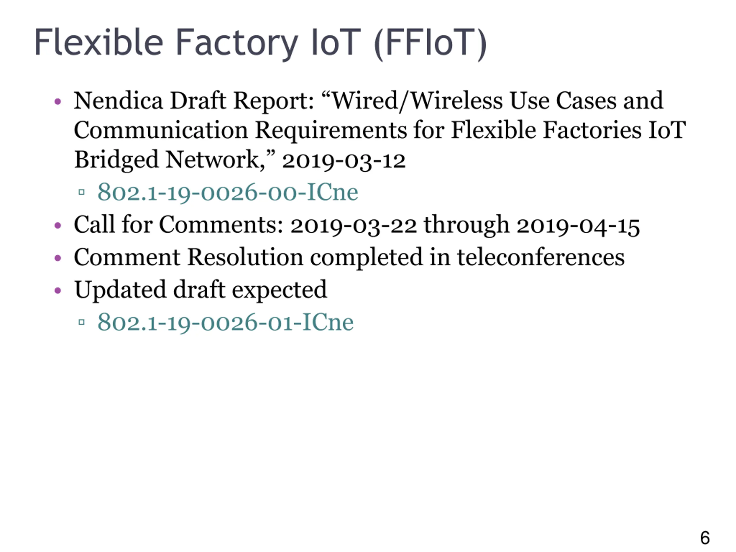 6 Flexible Factory IoT (FFIoT) Nendica Draft Report: Wired/Wireless Use Cases and Communication Requirements for Flexible Factories IoT Bridged Network, 2019-03-12 802.1-19-0026-00-ICne Call for Comments: 2019-03-22 through 2019-04-15 Comment Resolution completed in teleconferences Updated draft expected 802.1-19-0026-01-ICne 6
