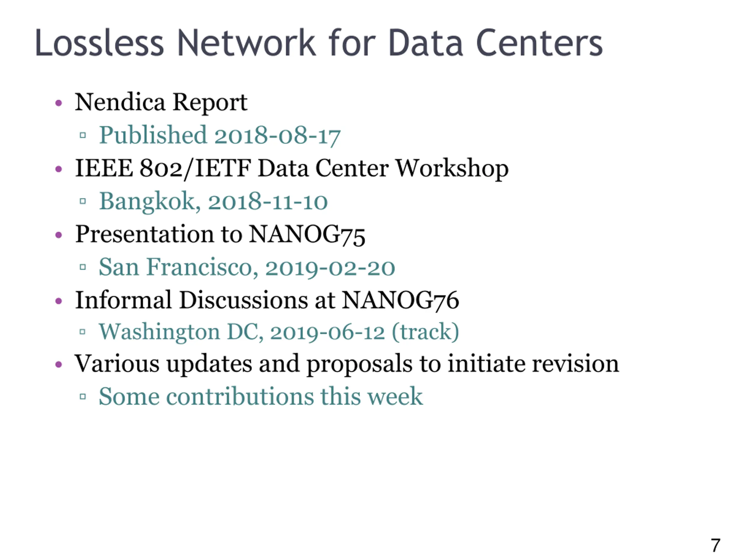 7 Lossless Network for Data Centers Nendica Report Published 2018-08-17 IEEE 802/IETF Data Center Workshop Bangkok, 2018-11-10 Presentation to NANOG75 San Francisco, 2019-02-20 Informal Discussions at NANOG76 Washington DC, 2019-06-12 (track) Various updates and proposals to initiate revision Some contributions this week 7