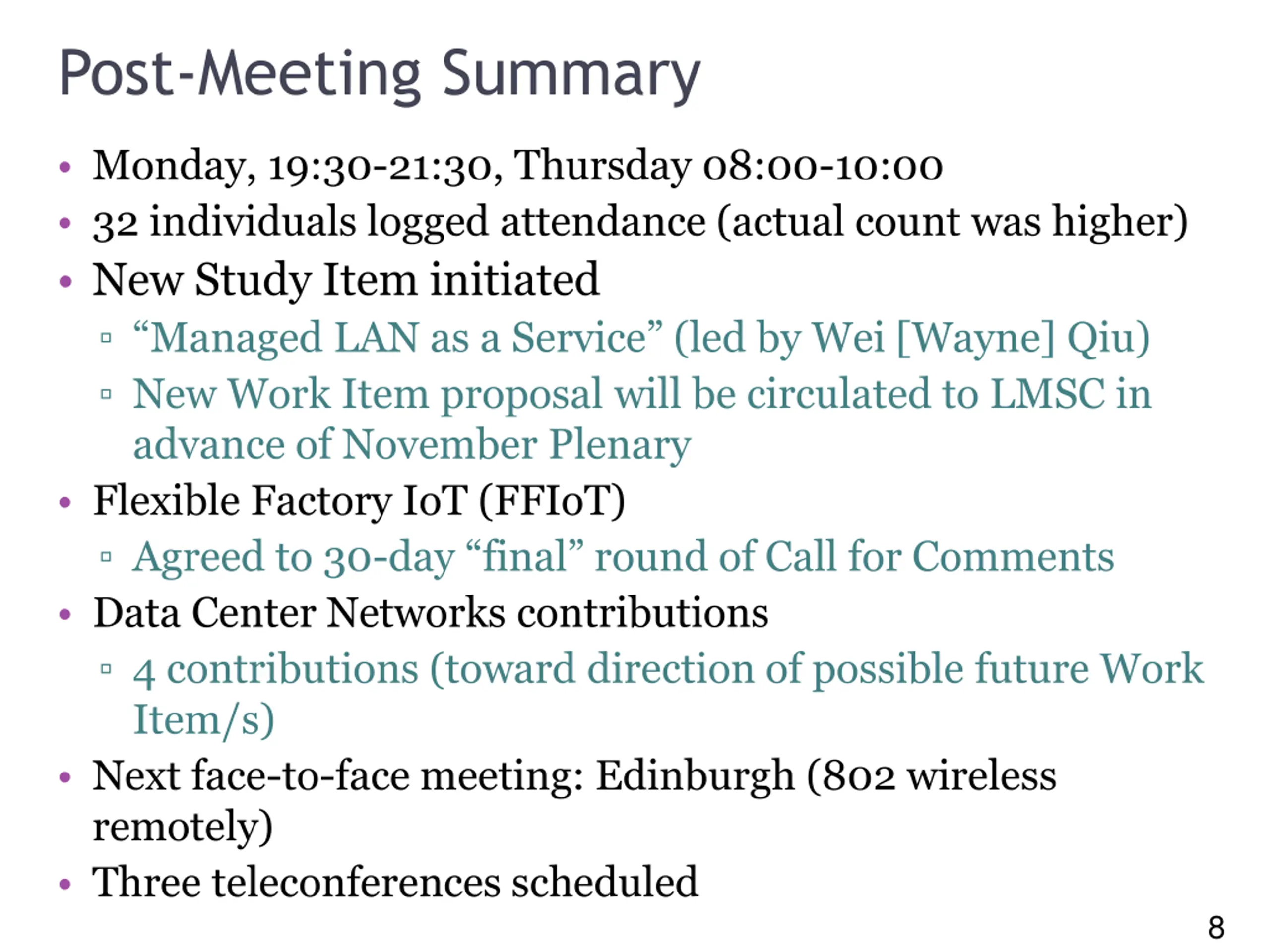 8 Post-Meeting Summary Monday, 19:30-21:30, Thursday 08:00-10:00 32 individuals logged attendance (actual count was higher) New Study Item initiated Managed LAN as a Service (led by Wei [Wayne] Qiu) New Work Item proposal will be circulated to LMSC in advance of November Plenary Flexible Factory IoT (FFIoT) Agreed to 30-day final round of Call for Comments Data Center Networks contributions 4 contributions (toward direction of possible future Work Item/s) Next face-to-face meeting: Edinburgh (802 wireless remotely) Three teleconferences scheduled 8