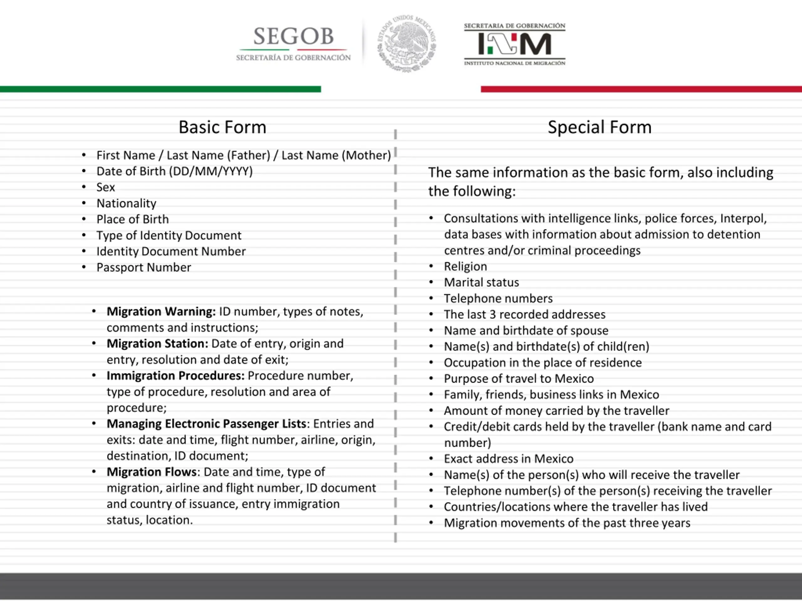 Basic Form Special Form First Name / Last Name (Father) / Last Name (Mother) Date of Birth (DD/MM/YYYY) Sex Nationality Place of Birth Type of Identity Document Identity Document Number Passport Number The same information as the basic form, also including the following: Consultations with intelligence links, police forces, Interpol, data bases with information about admission to detention centres and/or criminal proceedings Religion Marital status Telephone numbers The last 3 recorded addresses Name and birthdate of spouse Name(s) and birthdate(s) of child(ren) Occupation in the place of residence Purpose of travel to Mexico Family, friends, business links in Mexico Amount of money carried by the traveller Credit/debit cards held by the traveller (bank name and card number) Exact address in Mexico Name(s) of the person(s) who will receive the traveller Telephone number(s) of the person(s) receiving the traveller Countries/locations where the traveller has lived Migration movements of the past three years Migration Warning: ID number, types of notes, comments and instructions; Migration Station: Date of entry, origin and entry, resolution and date of exit; Immigration Procedures: Procedure number, type of procedure, resolution and area of procedure; Managing Electronic Passenger Lists: Entries and exits: date and time, flight number, airline, origin, destination, ID document; Migration Flows: Date and time, type of migration, airline and flight number, ID document and country of issuance, entry immigration status, location.