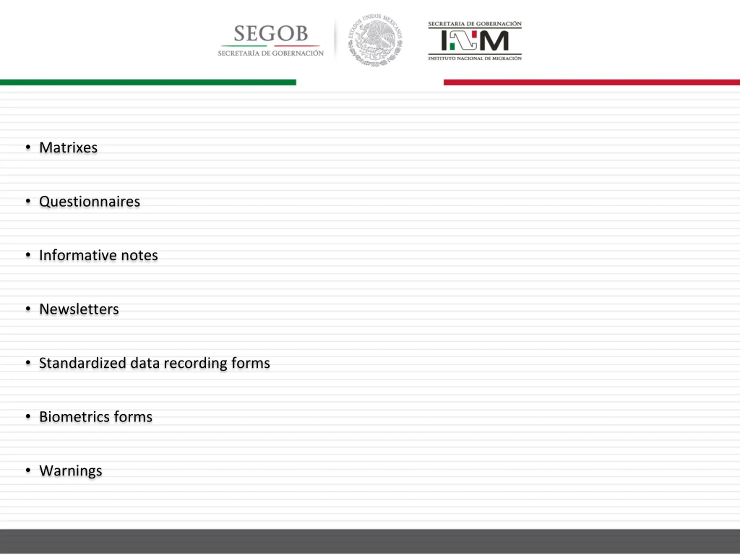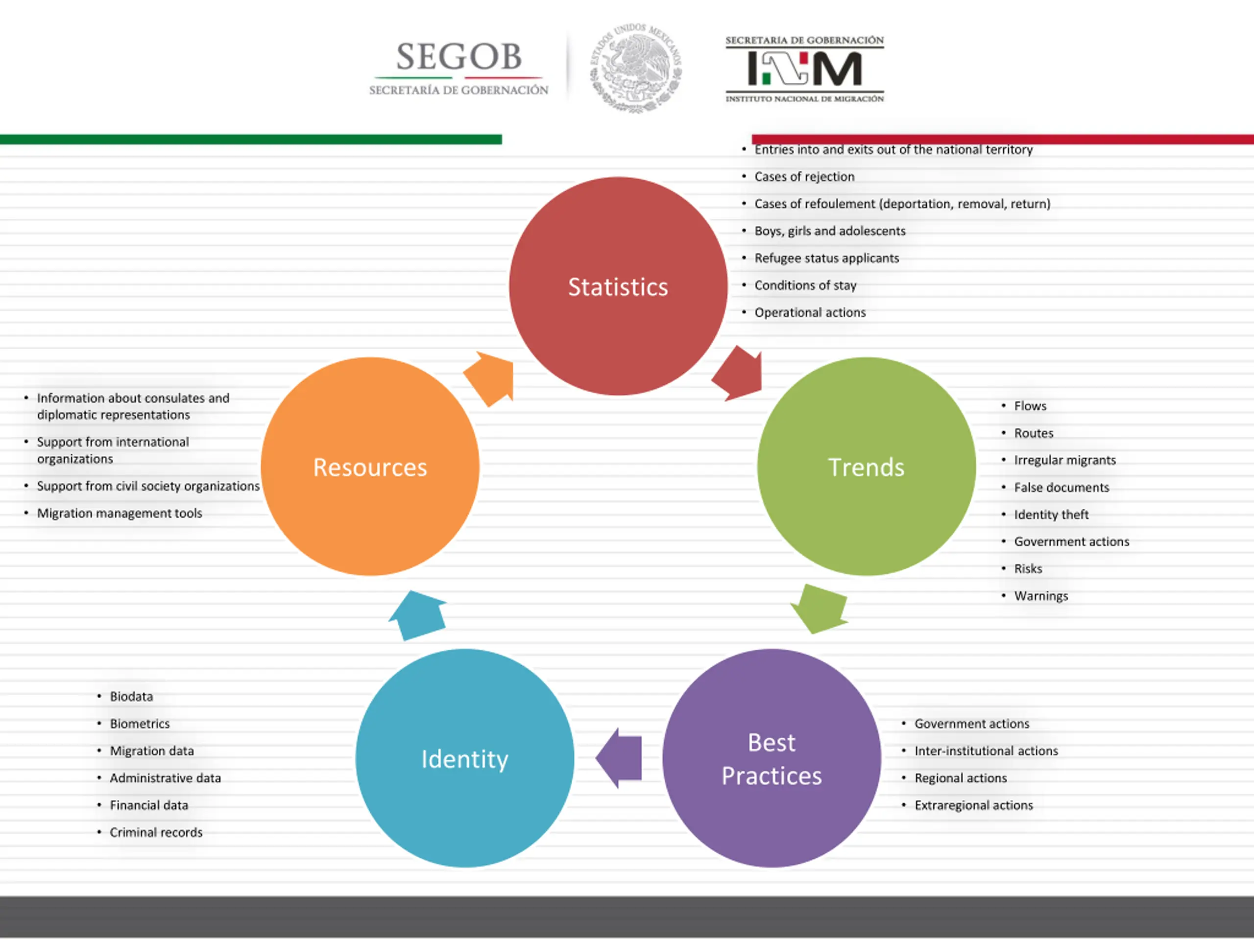 Entries into and exits out of the national territory Cases of rejection Cases of refoulement (deportation, removal, return) Boys, girls and adolescents Refugee status applicants Statistics Conditions of stay Operational actions Information about consulates and diplomatic representations Flows Routes Support from international organizations Irregular migrants Resources Trends Support from civil society organizations False documents Migration management tools Identity theft Government actions Risks Warnings Biodata Biometrics Government actions Best Practices Migration data Inter-institutional actions Identity Administrative data Regional actions Financial data Extraregional actions Criminal records