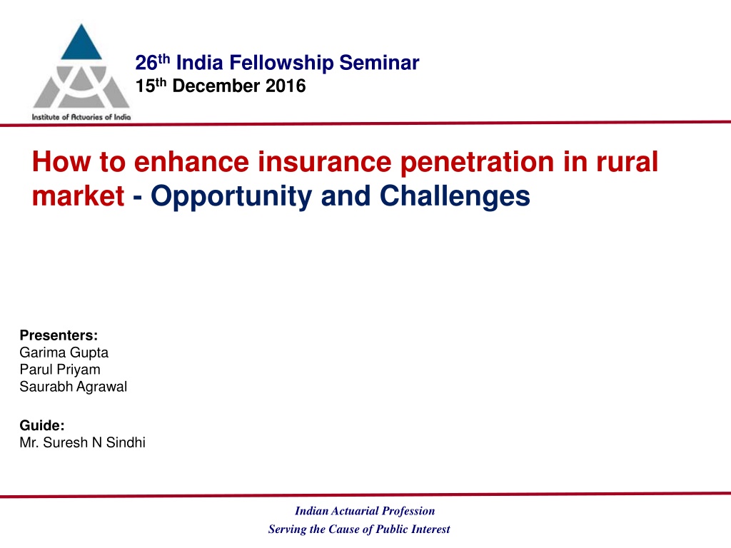 26th India Fellowship Seminar 15th December 2016 How to enhance insurance penetration in rural market - Opportunity and Challenges Presenters: Garima Gupta Parul Priyam Saurabh Agrawal Guide: Mr. Suresh N Sindhi Indian Actuarial Profession Serving the Cause of Public Interest