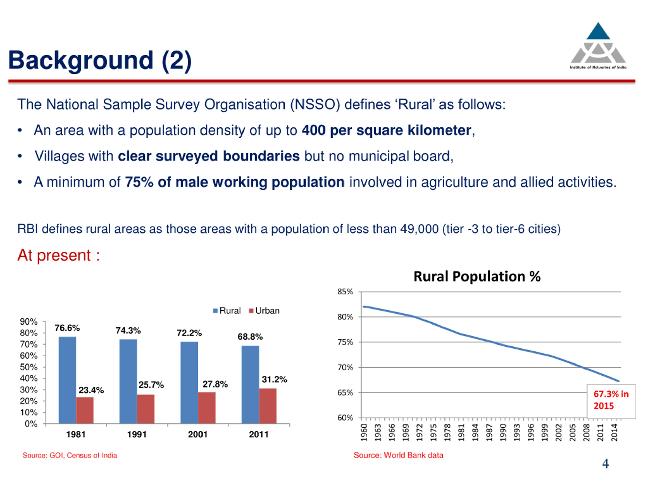 Background (2) The National Sample Survey Organisation (NSSO) defines Rural as follows: An area with a population density of up to 400 per square kilometer, Villages with clear surveyed boundaries but no municipal board, A minimum of 75% of male working population involved in agriculture and allied activities. RBI defines rural areas as those areas with a population of less than 49,000 (tier -3 to tier-6 cities) At present : Rural Population % 85% Rural Urban 80% 90% 76.6% 74.3% 80% 72.2% 68.8% 75% 70% 60% 50% 70% 40% 31.2% 27.8% 25.7% 30% 23.4% 65% 67.3% in 2015 20% 10% 60% 0% 1960 1963 1966 1969 1972 1975 1978 1981 1984 1987 1990 1993 1996 1999 2002 2005 2008 2011 2014 1981 1991 2001 2011 Source: World Bank data Source: GOI, Census of India 4