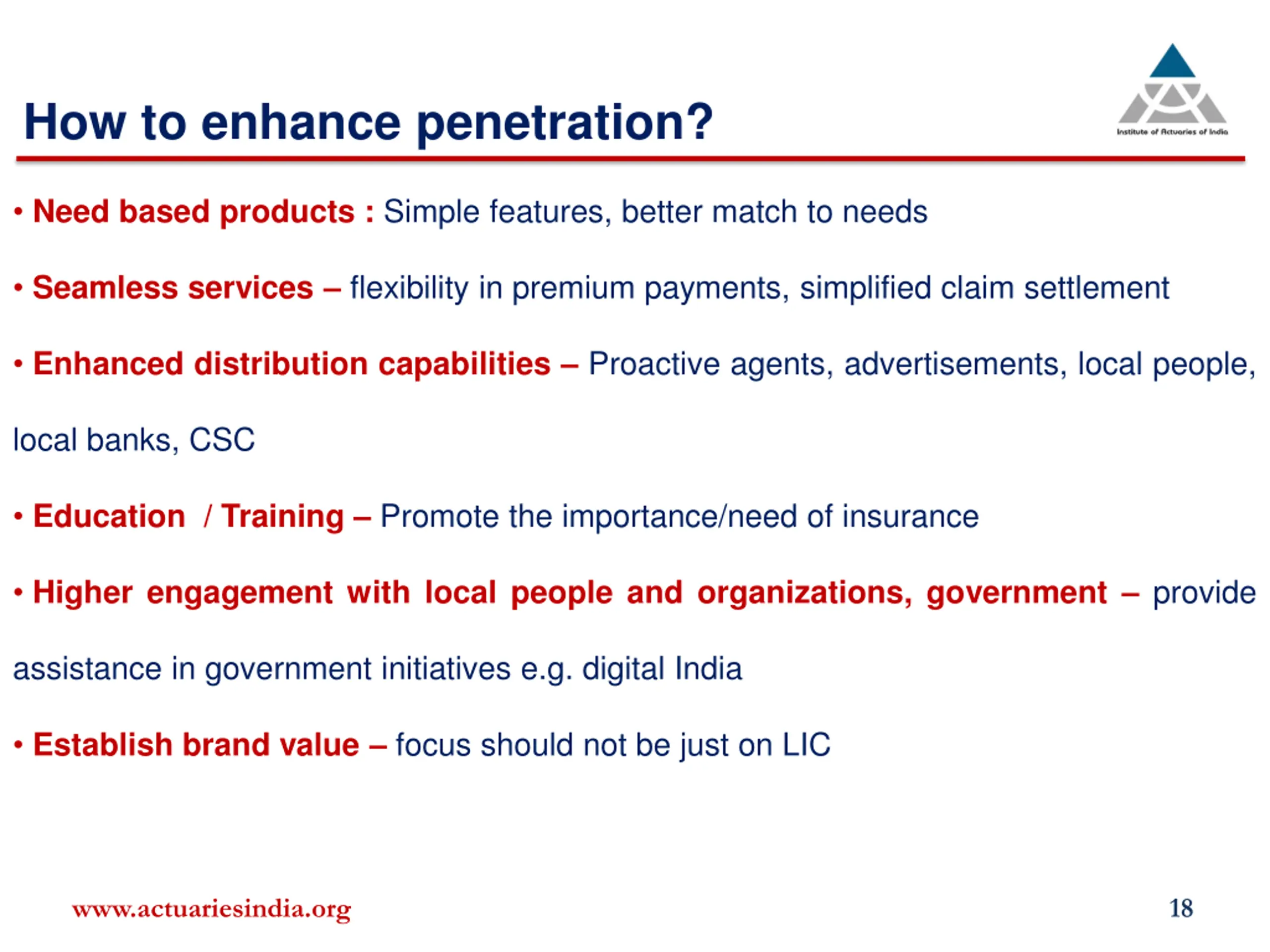 How to enhance penetration? Need based products : Simple features, better match to needs Seamless services flexibility in premium payments, simplified claim settlement Enhanced distribution capabilities Proactive agents, advertisements, local people, local banks, CSC Education / Training Promote the importance/need of insurance Higher engagement with local people and organizations, government provide assistance in government initiatives e.g. digital India Establish brand value focus should not be just on LIC www.actuariesindia.org 18