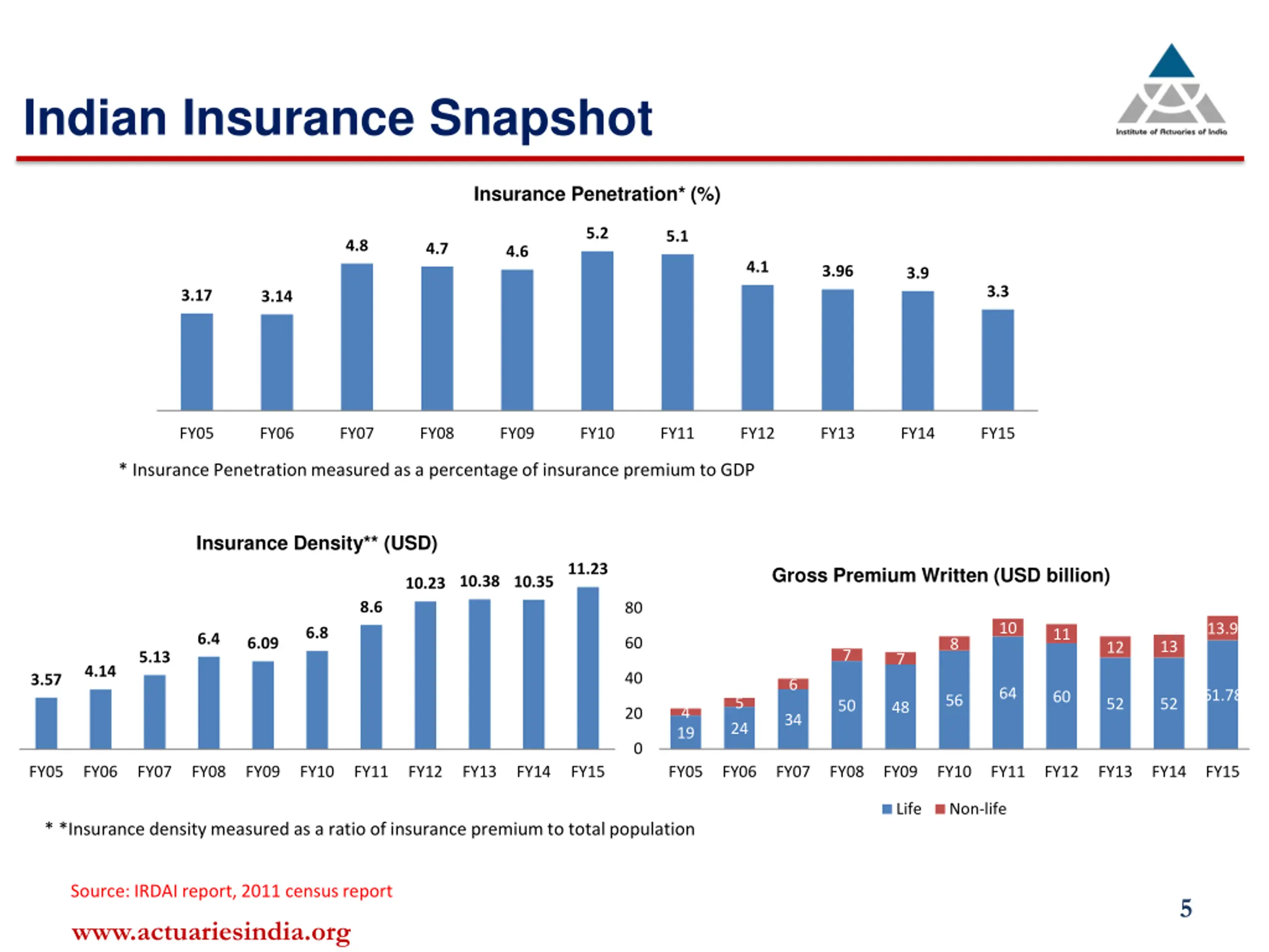 Indian Insurance Snapshot Insurance Penetration* (%) 5.2 5.1 4.8 4.7 4.6 4.1 3.96 3.9 3.3 3.17 3.14 FY05 FY06 FY07 FY08 FY09 FY10 FY11 FY12 FY13 FY14 FY15 * Insurance Penetration measured as a percentage of insurance premium to GDP Insurance Density** (USD) 11.23 Gross Premium Written (USD billion) 10.23 10.38 10.35 8.6 80 10 13.9 6.8 11 6.4 60 6.09 8 13 12 7 5.13 7 4.14 40 3.57 6 64 61.78 60 56 5 52 52 50 48 4 20 34 24 19 0 FY05 FY06 FY07 FY08 FY09 FY10 FY11 FY12 FY13 FY14 FY15 FY05 FY06 FY07 FY08 FY09 FY10 FY11 FY12 FY13 FY14 FY15 Life Non-life * *Insurance density measured as a ratio of insurance premium to total population Source: IRDAI report, 2011 census report 5 www.actuariesindia.org