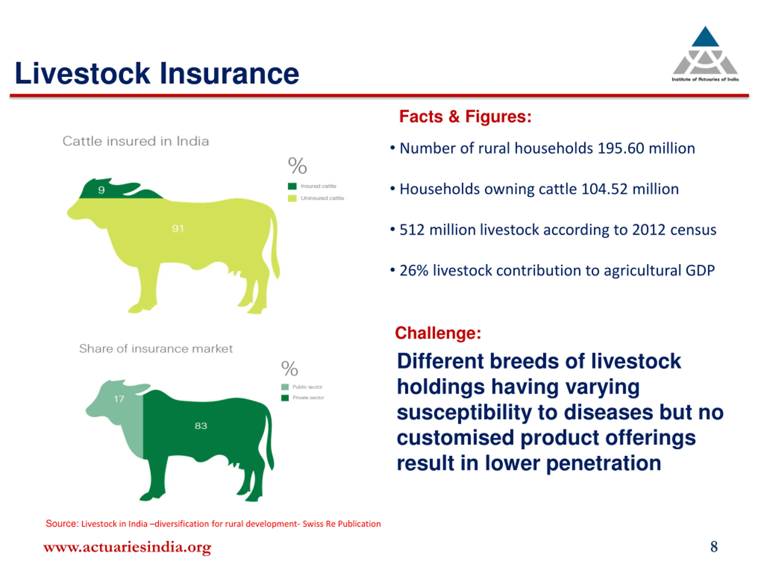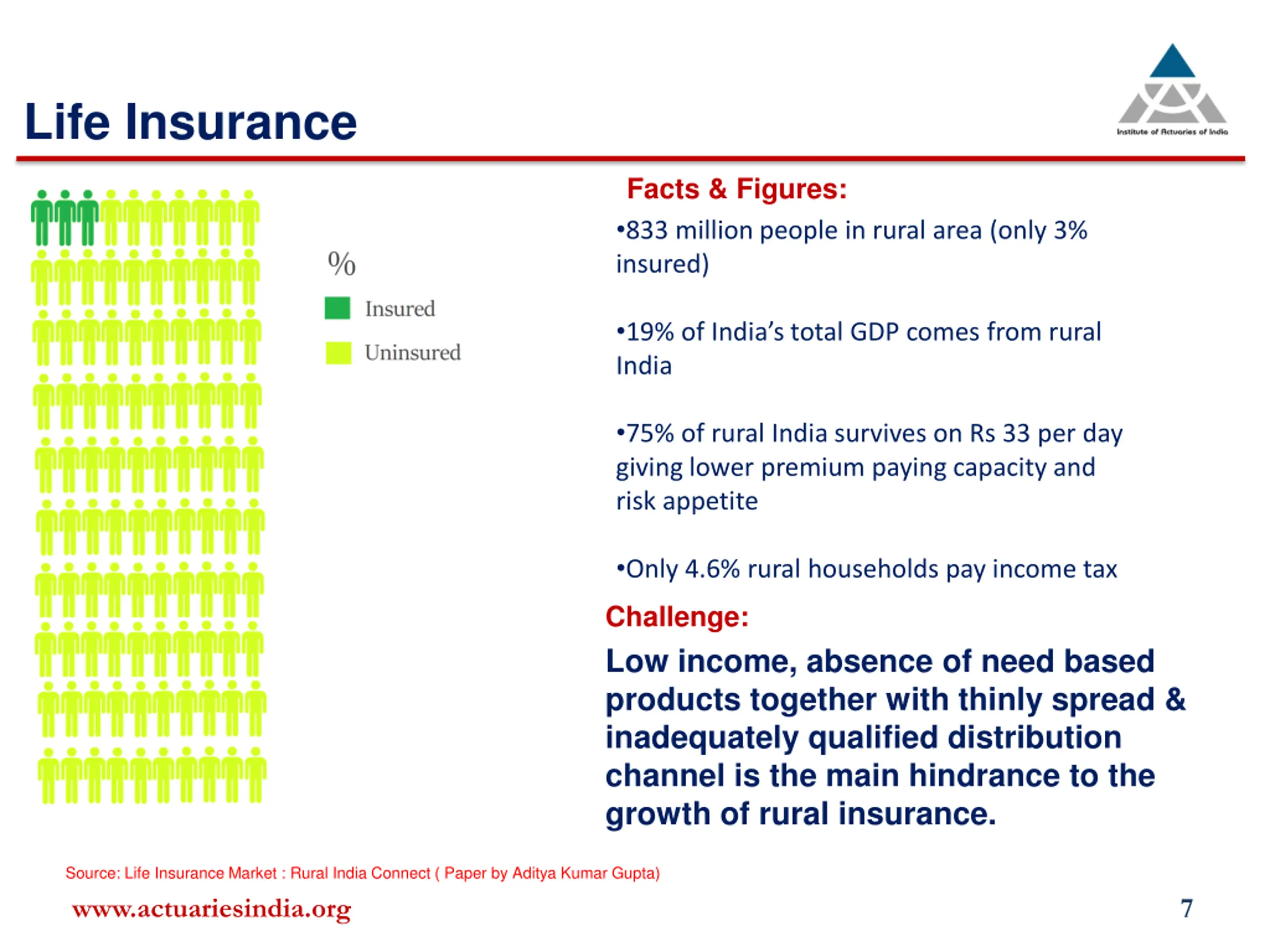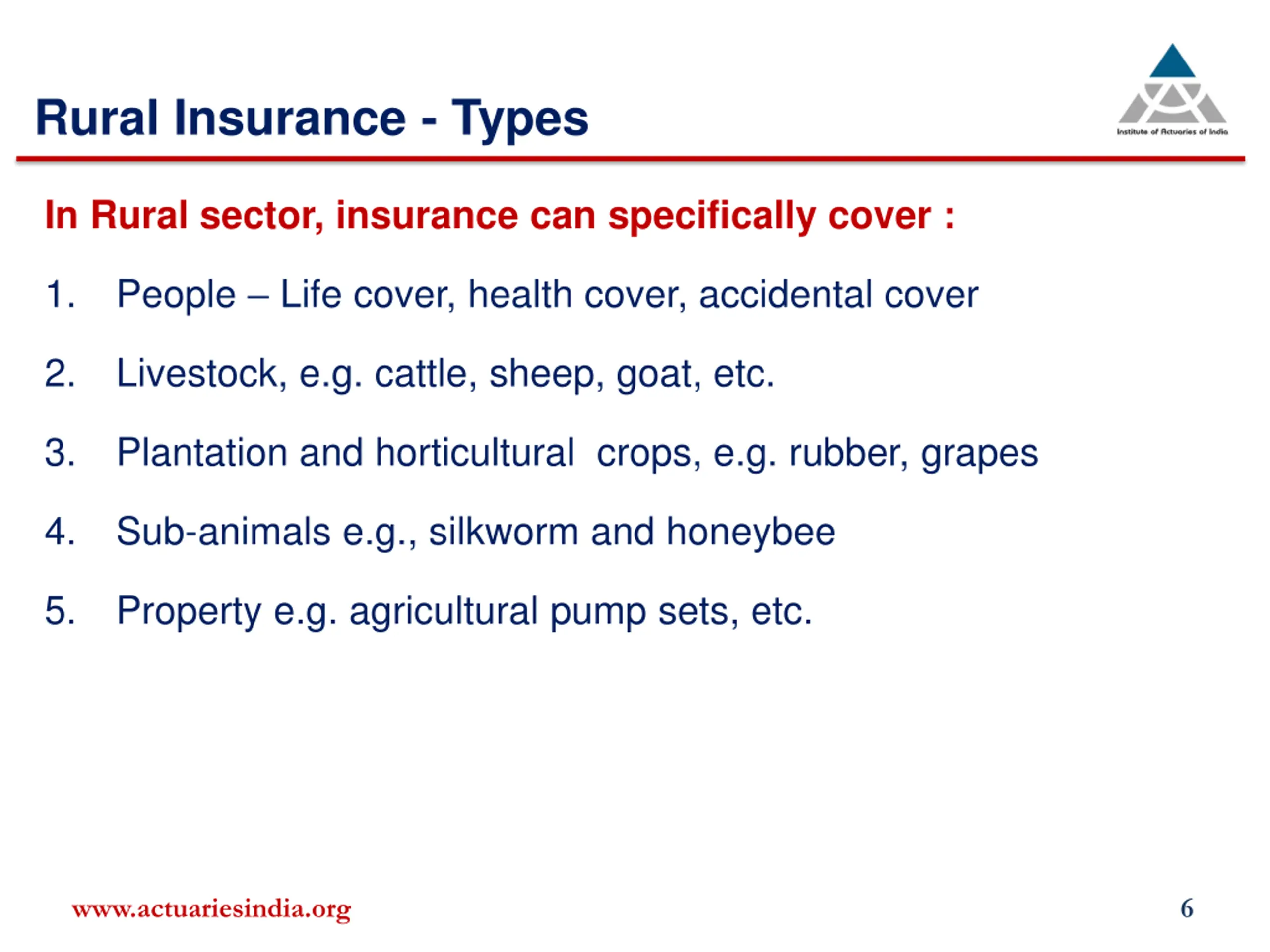 Rural Insurance - Types In Rural sector, insurance can specifically cover : 1. People Life cover, health cover, accidental cover 2. Livestock, e.g. cattle, sheep, goat, etc. 3. Plantation and horticultural crops, e.g. rubber, grapes 4. Sub-animals e.g., silkworm and honeybee 5. Property e.g. agricultural pump sets, etc. www.actuariesindia.org 6