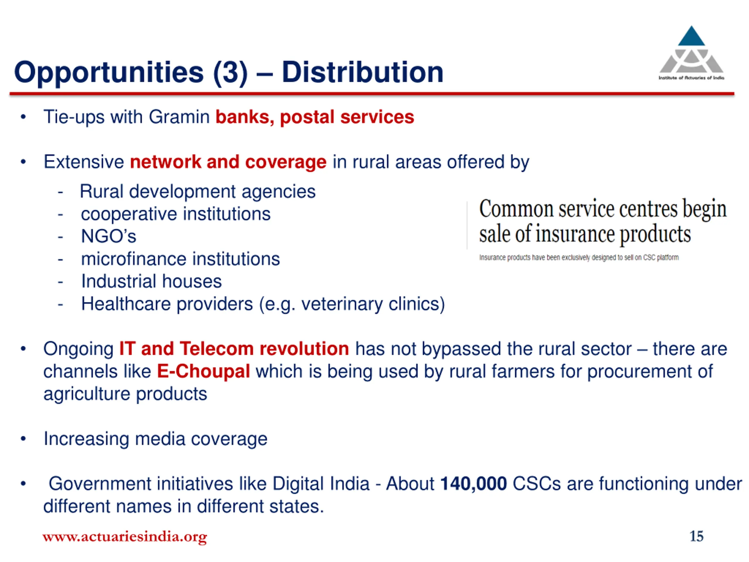 Opportunities (2) Specific features Dependence on Agriculture - Higher need for safety of crops, livestock from extreme weather conditions such as: o Untimely rain/floods o Drought o Bush fire o Hailstorm - Need to insure farm vehicles Asset/ key person dependency usually rural families are family financially dependent on one key earning member and hence life/health insurance important Strong habit of saving several studies show that an average rural household saves about one third of their incomes Greater need for health insurance products - Level of healthcare in rural areas is substantially low. Low supply of hospital beds, doctors and other facilities. Seasonal income majority involved in farming www.actuariesindia.org 14