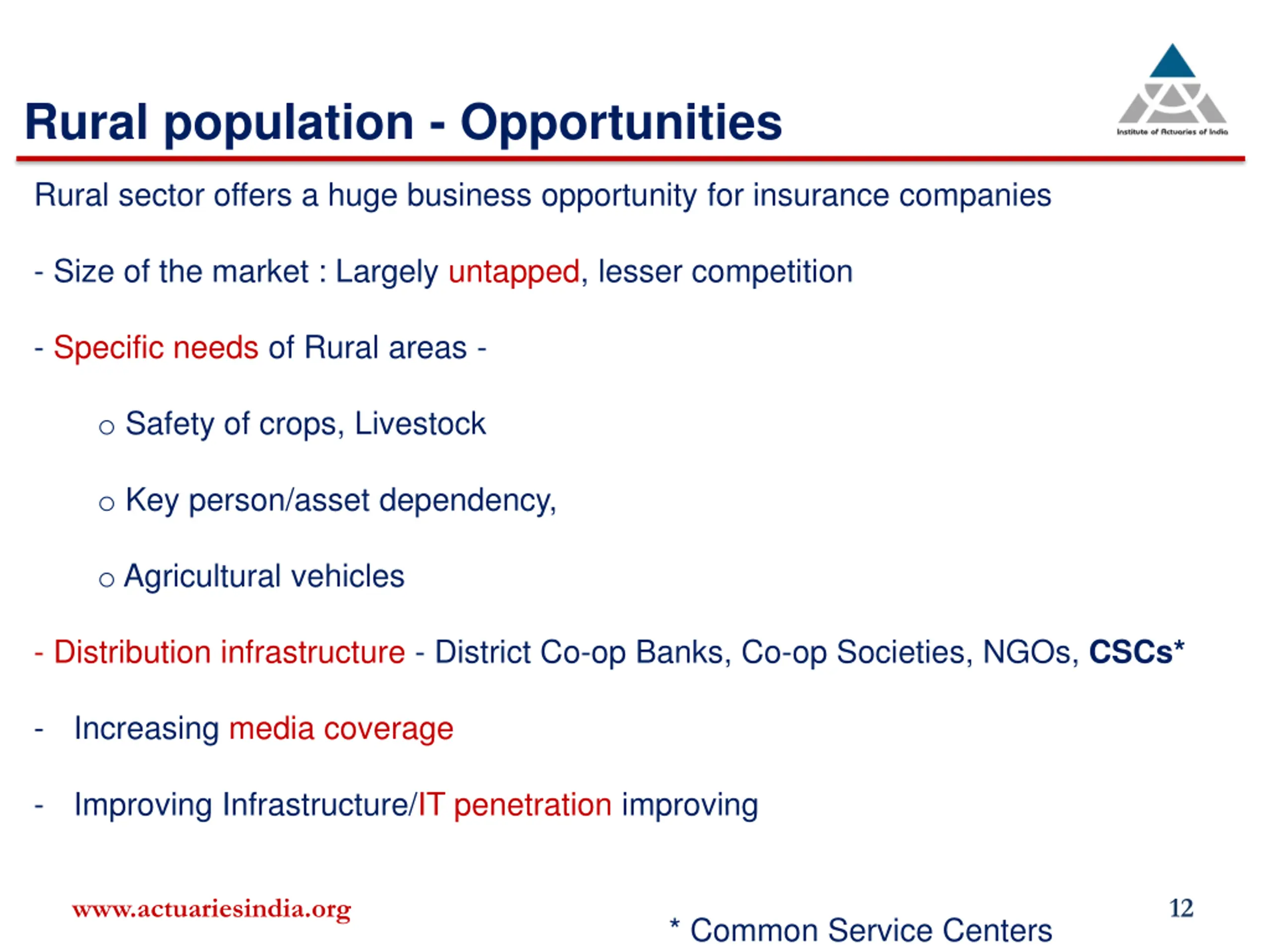 IRDA Regulation Every insurer, who begins to carry on insurance business after the commencement of the IRDA Act, 1999 (41 of 1999), shall, for the purposes of sections 32B and 32C of the Act, ensure that he undertakes the following obligations, during the first five financial years, pertaining to the persons in rural sector - Life Insurer General Insurer Financial Year % of total policies written direct in that year Financial Year % of total gross premium income written direct in that year 1st 2% 1st 7% 2nd 9% 2nd 3% 3rd 12% 3rd and above 5% 4th 14% 5th 16% 6th & 7th 18% 8th & 9th 19% 10th to 15th 20% 16th and above 25% www.actuariesindia.org 11