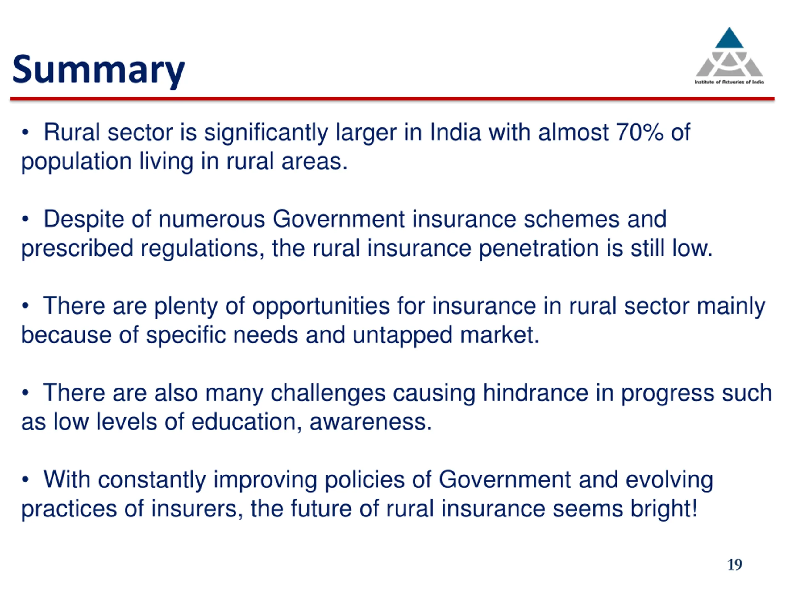 Summary Rural sector is significantly larger in India with almost 70% of population living in rural areas. Despite of numerous Government insurance schemes and prescribed regulations, the rural insurance penetration is still low. There are plenty of opportunities for insurance in rural sector mainly because of specific needs and untapped market. There are also many challenges causing hindrance in progress such as low levels of education, awareness. With constantly improving policies of Government and evolving practices of insurers, the future of rural insurance seems bright! 19