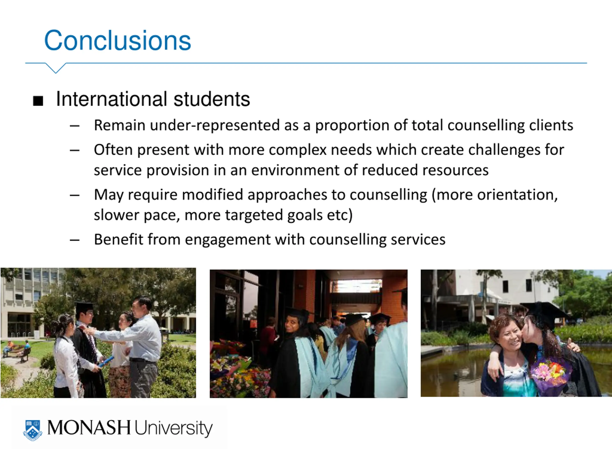 Conclusions International students Remain under-represented as a proportion of total counselling clients Often present with more complex needs which create challenges for service provision in an environment of reduced resources May require modified approaches to counselling (more orientation, slower pace, more targeted goals etc) Benefit from engagement with counselling services