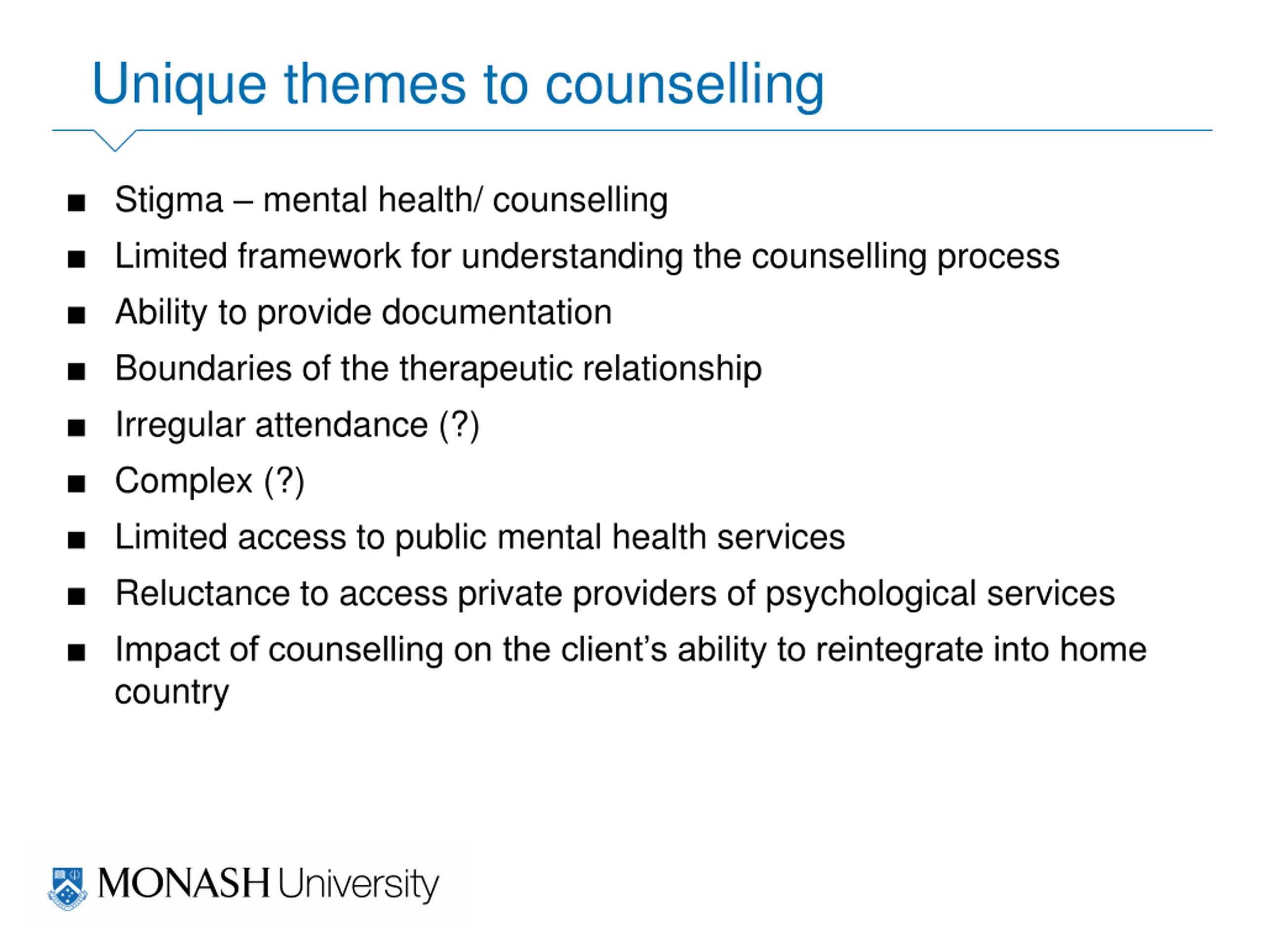 Unique themes to counselling Stigma mental health/ counselling Limited framework for understanding the counselling process Ability to provide documentation Boundaries of the therapeutic relationship Irregular attendance (?) Complex (?) Limited access to public mental health services Reluctance to access private providers of psychological services Impact of counselling on the client s ability to reintegrate into home country
