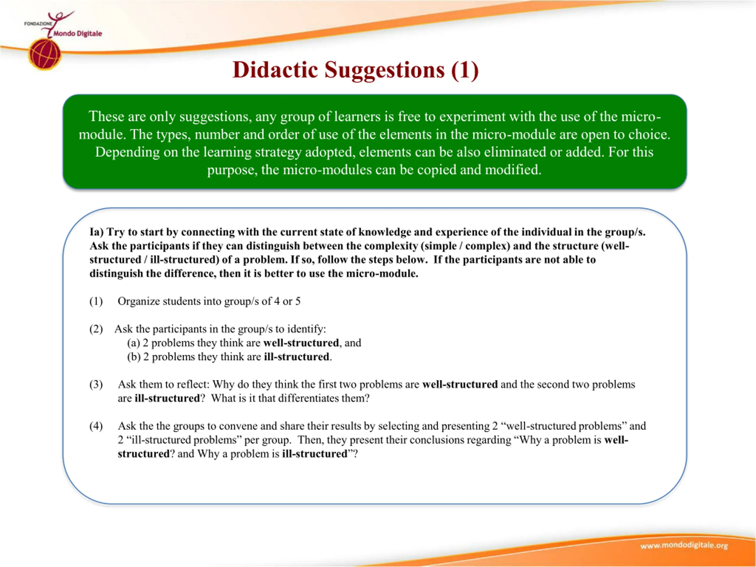 Didactic Suggestions (1) These are only suggestions, any group of learners is free to experiment with the use of the micro- module. The types, number and order of use of the elements in the micro-module are open to choice. Depending on the learning strategy adopted, elements can be also eliminated or added. For this purpose, the micro-modules can be copied and modified. Ia) Try to start by connecting with the current state of knowledge and experience of the individual in the group/s. Ask the participants if they can distinguish between the complexity (simple / complex) and the structure (well- structured / ill-structured) of a problem. If so, follow the steps below. If the participants are not able to distinguish the difference, then it is better to use the micro-module. (1) Organize students into group/s of 4 or 5 (2) Ask the participants in the group/s to identify: (a) 2 problems they think are well-structured, and (b) 2 problems they think are ill-structured. (3) Ask them to reflect: Why do they think the first two problems are well-structured and the second two problems are ill-structured? What is it that differentiates them? (4) Ask the the groups to convene and share their results by selecting and presenting 2 well-structured problems and 2 ill-structured problems per group. Then, they present their conclusions regarding Why a problem is well- structured? and Why a problem is ill-structured ?