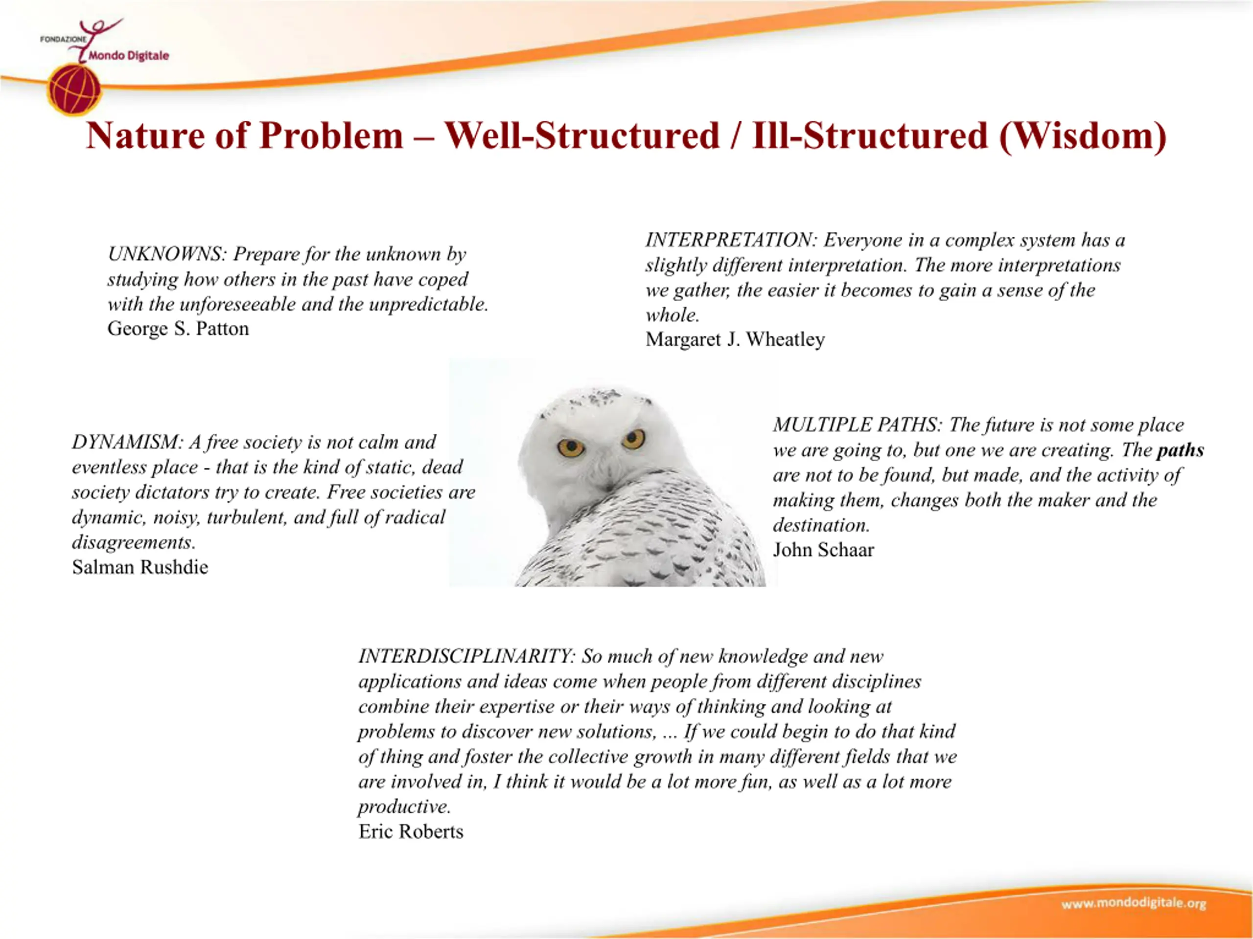 Nature of Problem Well-Structured / Ill-Structured (Wisdom) INTERPRETATION: Everyone in a complex system has a slightly different interpretation. The more interpretations we gather, the easier it becomes to gain a sense of the whole. Margaret J. Wheatley UNKNOWNS: Prepare for the unknown by studying how others in the past have coped with the unforeseeable and the unpredictable. George S. Patton MULTIPLE PATHS: The future is not some place we are going to, but one we are creating. The paths are not to be found, but made, and the activity of making them, changes both the maker and the destination. John Schaar DYNAMISM: A free society is not calm and eventless place - that is the kind of static, dead society dictators try to create. Free societies are dynamic, noisy, turbulent, and full of radical disagreements. Salman Rushdie INTERDISCIPLINARITY: So much of new knowledge and new applications and ideas come when people from different disciplines combine their expertise or their ways of thinking and looking at problems to discover new solutions, ... If we could begin to do that kind of thing and foster the collective growth in many different fields that we are involved in, I think it would be a lot more fun, as well as a lot more productive. Eric Roberts