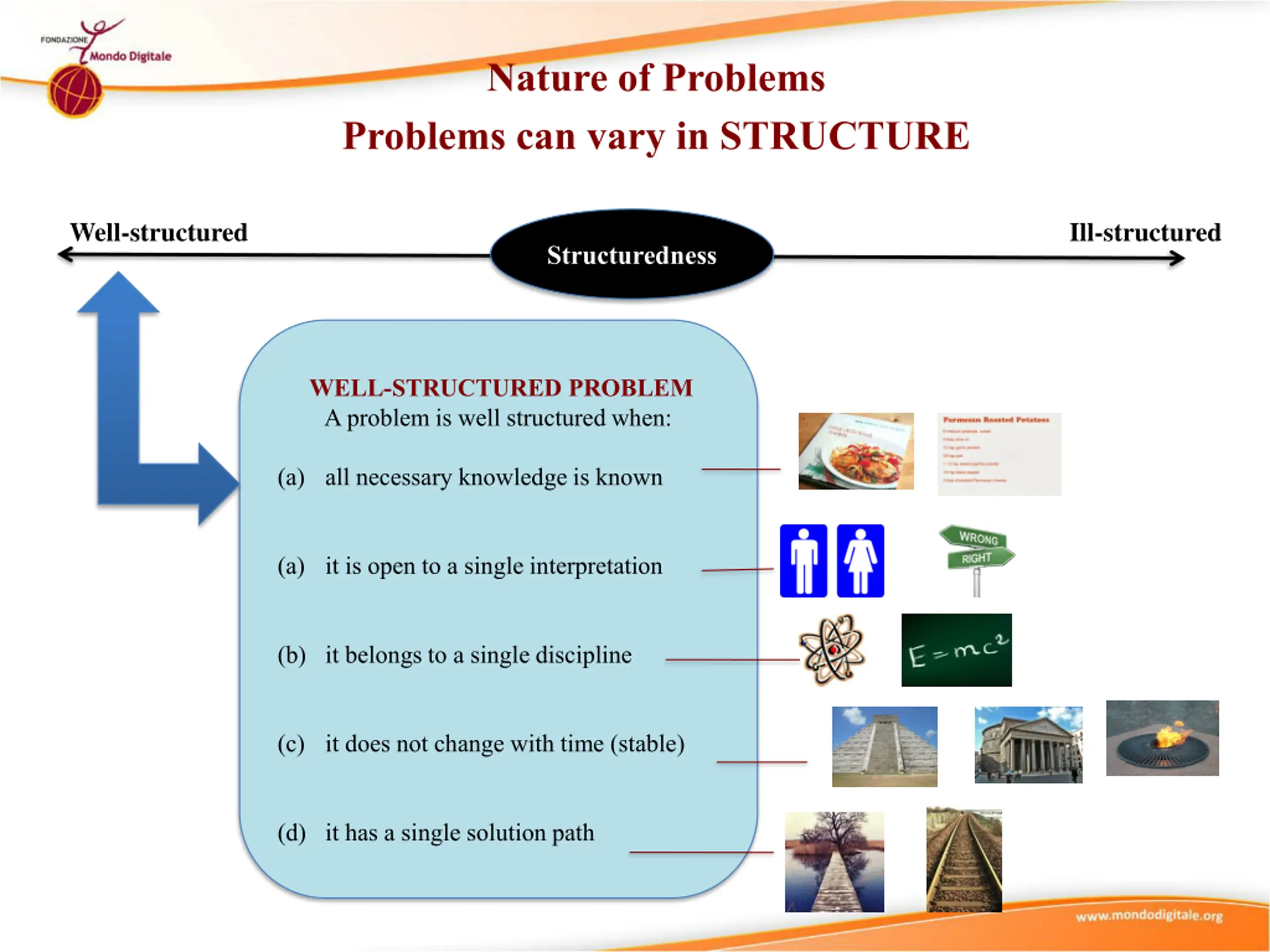 Didactic Suggestions (3) (IIa) Use the micro-module Nature of the Problems - Structure to reinforce and deepen the understanding of the concept of Structure in Nature of Problems. (1) Introduce the micro-module Nature of Problems - Structure to the participants, explaining its multimedia, multi-dimensional, multi-role, multi-didactic intention. Explain that this is a more complex micro-module made up of several concepts. (2) Ask the participants in the group/s to focus first on the concept of Structure and explore individually the micro-module searching, focusing their attention and reflecting on those elements they find most effective in reinforcing and deepening their understanding of the concept of Structure in the Nature of Problems. (1) The participants tell their groups about their first 3 choices of most effective elements and explain why they have selected them. The participants reflect collectively about their choices and their reasons. If some participants do not find the types of elements most appropriate to them, they can tell about those element and, even better, find them and contribute them to the micro-module.