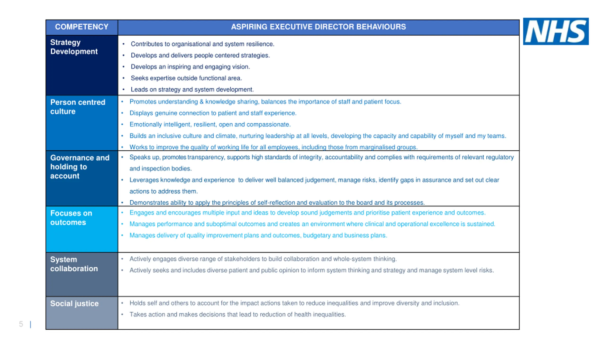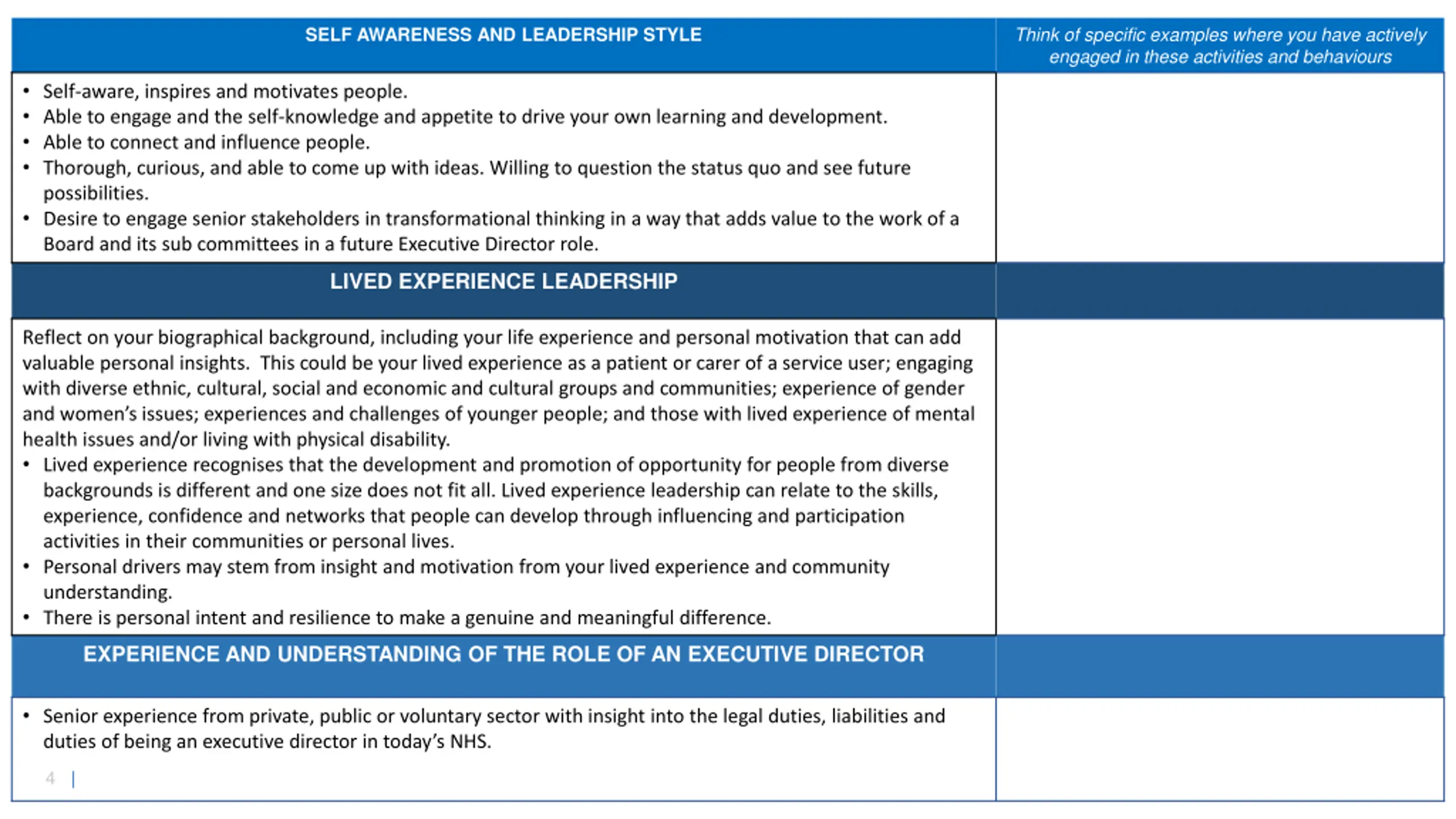 Think of specific examples where you have actively engaged in these activities and behaviours SELF AWARENESS AND LEADERSHIP STYLE Self-aware, inspires and motivates people. Able to engage and the self-knowledge and appetite to drive your own learning and development. Able to connect and influence people. Thorough, curious, and able to come up with ideas. Willing to question the status quo and see future possibilities. Desire to engage senior stakeholders in transformational thinking in a way that adds value to the work of a Board and its sub committees in a future Executive Director role. LIVED EXPERIENCE LEADERSHIP Reflect on your biographical background, including your life experience and personal motivation that can add valuable personal insights. This could be your lived experience as a patient or carer of a service user; engaging with diverse ethnic, cultural, social and economic and cultural groups and communities; experience of gender and women s issues; experiences and challenges of younger people; and those with lived experience of mental health issues and/or living with physical disability. Lived experience recognises that the development and promotion of opportunity for people from diverse backgrounds is different and one size does not fit all. Lived experience leadership can relate to the skills, experience, confidence and networks that people can develop through influencing and participation activities in their communities or personal lives. Personal drivers may stem from insight and motivation from your lived experience and community understanding. There is personal intent and resilience to make a genuine and meaningful difference. EXPERIENCE AND UNDERSTANDING OF THE ROLE OF AN EXECUTIVE DIRECTOR Senior experience from private, public or voluntary sector with insight into the legal duties, liabilities and duties of being an executive director in today s NHS. 4 |