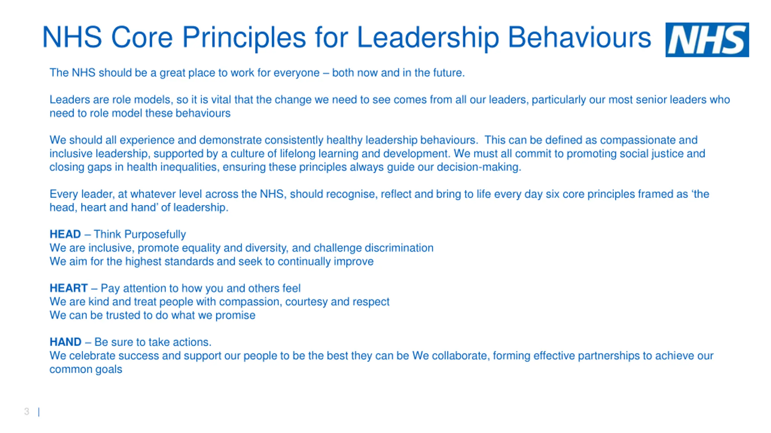 NHS Core Principles for Leadership Behaviours The NHS should be a great place to work for everyone both now and in the future. Leaders are role models, so it is vital that the change we need to see comes from all our leaders, particularly our most senior leaders who need to role model these behaviours We should all experience and demonstrate consistently healthy leadership behaviours. This can be defined as compassionate and inclusive leadership, supported by a culture of lifelong learning and development. We must all commit to promoting social justice and closing gaps in health inequalities, ensuring these principles always guide our decision-making. Every leader, at whatever level across the NHS, should recognise, reflect and bring to life every day six core principles framed as the head, heart and hand of leadership. HEAD Think Purposefully We are inclusive, promote equality and diversity, and challenge discrimination We aim for the highest standards and seek to continually improve HEART Pay attention to how you and others feel We are kind and treat people with compassion, courtesy and respect We can be trusted to do what we promise HAND Be sure to take actions. We celebrate success and support our people to be the best they can be We collaborate, forming effective partnerships to achieve our common goals 3 |