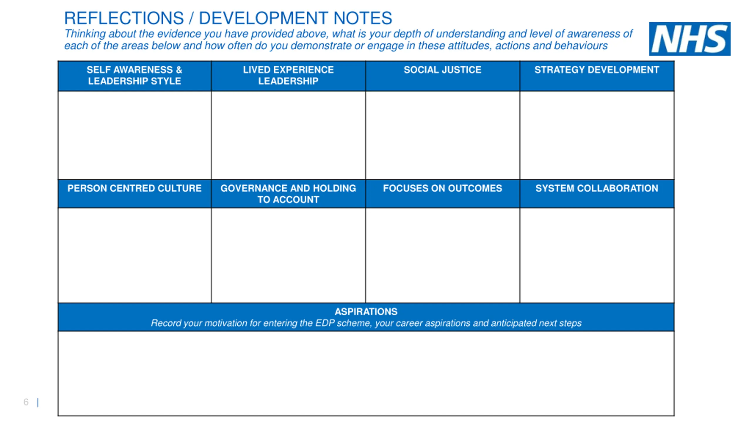 REFLECTIONS / DEVELOPMENT NOTES Thinking about the evidence you have provided above, what is your depth of understanding and level of awareness of each of the areas below and how often do you demonstrate or engage in these attitudes, actions and behaviours SELF AWARENESS & LEADERSHIP STYLE LIVED EXPERIENCE LEADERSHIP SOCIAL JUSTICE STRATEGY DEVELOPMENT PERSON CENTRED CULTURE GOVERNANCE AND HOLDING TO ACCOUNT FOCUSES ON OUTCOMES SYSTEM COLLABORATION ASPIRATIONS Record your motivation for entering the EDP scheme, your career aspirations and anticipated next steps 6 |