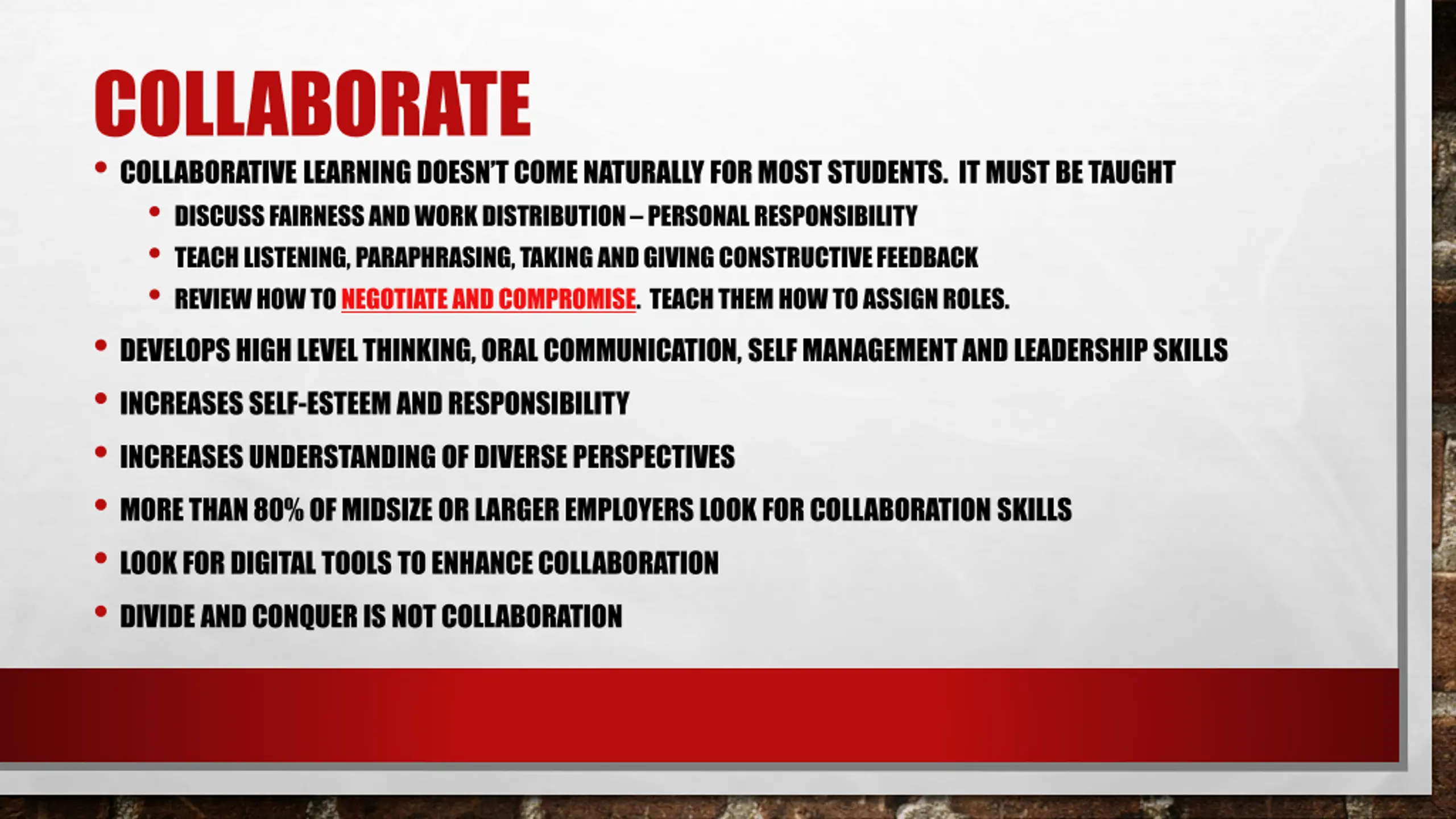 COLLABORATE COLLABORATIVE LEARNING DOESN T COME NATURALLY FOR MOST STUDENTS. IT MUST BE TAUGHT DISCUSS FAIRNESS AND WORK DISTRIBUTION PERSONAL RESPONSIBILITY TEACH LISTENING, PARAPHRASING, TAKING AND GIVING CONSTRUCTIVE FEEDBACK REVIEW HOW TO NEGOTIATE AND COMPROMISE. TEACH THEM HOW TO ASSIGN ROLES. DEVELOPS HIGH LEVEL THINKING, ORAL COMMUNICATION, SELF MANAGEMENT AND LEADERSHIP SKILLS INCREASES SELF-ESTEEM AND RESPONSIBILITY INCREASES UNDERSTANDING OF DIVERSE PERSPECTIVES MORE THAN 80% OF MIDSIZE OR LARGER EMPLOYERS LOOK FOR COLLABORATION SKILLS LOOK FOR DIGITAL TOOLS TO ENHANCE COLLABORATION DIVIDE AND CONQUER IS NOT COLLABORATION