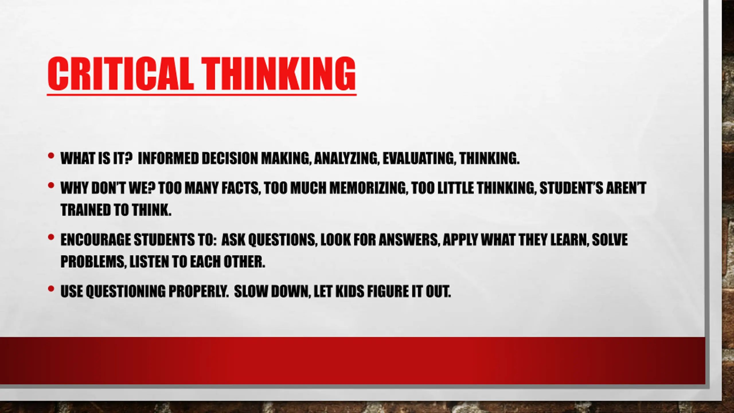 CRITICAL THINKING WHAT IS IT? INFORMED DECISION MAKING, ANALYZING, EVALUATING, THINKING. WHY DON T WE? TOO MANY FACTS, TOO MUCH MEMORIZING, TOO LITTLE THINKING, STUDENT S AREN T TRAINED TO THINK. ENCOURAGE STUDENTS TO: ASK QUESTIONS, LOOK FOR ANSWERS, APPLY WHAT THEY LEARN, SOLVE PROBLEMS, LISTEN TO EACH OTHER. USE QUESTIONING PROPERLY. SLOW DOWN, LET KIDS FIGURE IT OUT.