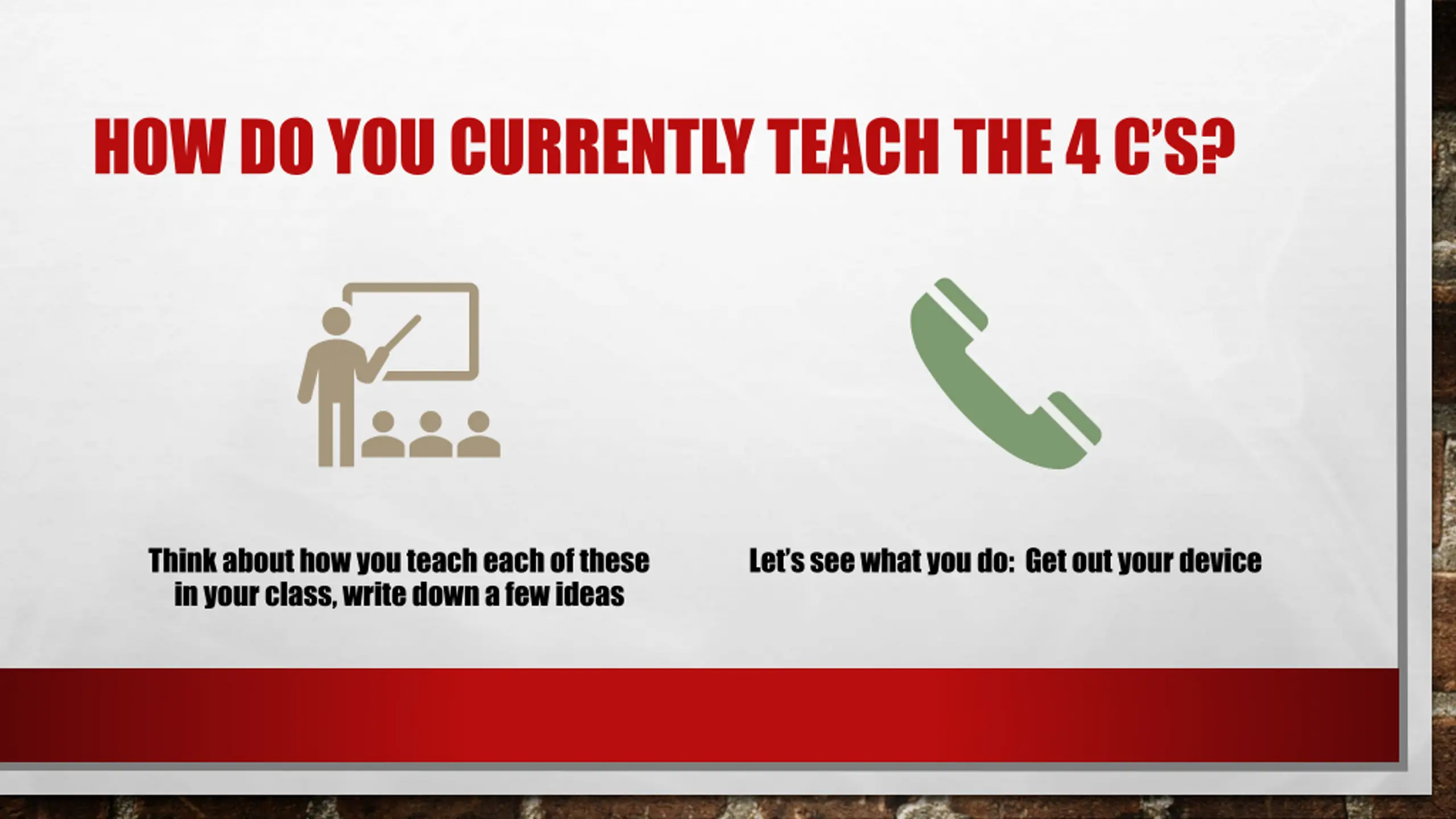 HOW DO YOU CURRENTLY TEACH THE 4 CS? Think about how you teach each of these in your class, write down a few ideas Let s see what you do: Get out your device