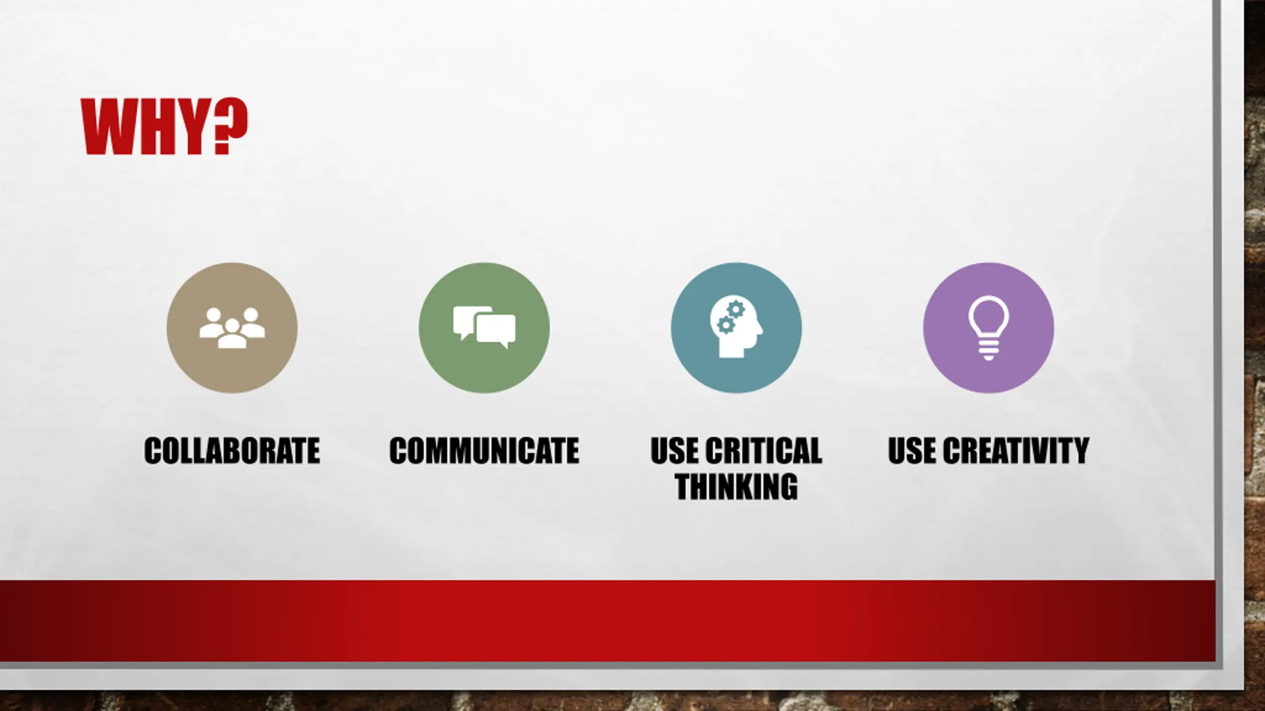 WHY? COLLABORATE COMMUNICATE USE CRITICAL THINKING USE CREATIVITY