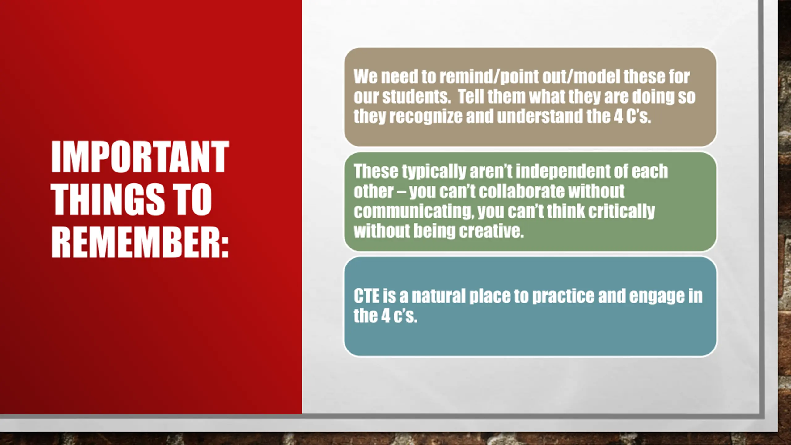 We need to remind/point out/model these for our students. Tell them what they are doing so they recognize and understand the 4 C s. IMPORTANT THINGS TO REMEMBER: These typically aren t independent of each other you can t collaborate without communicating, you can t think critically without being creative. CTE is a natural place to practice and engage in the 4 c s.