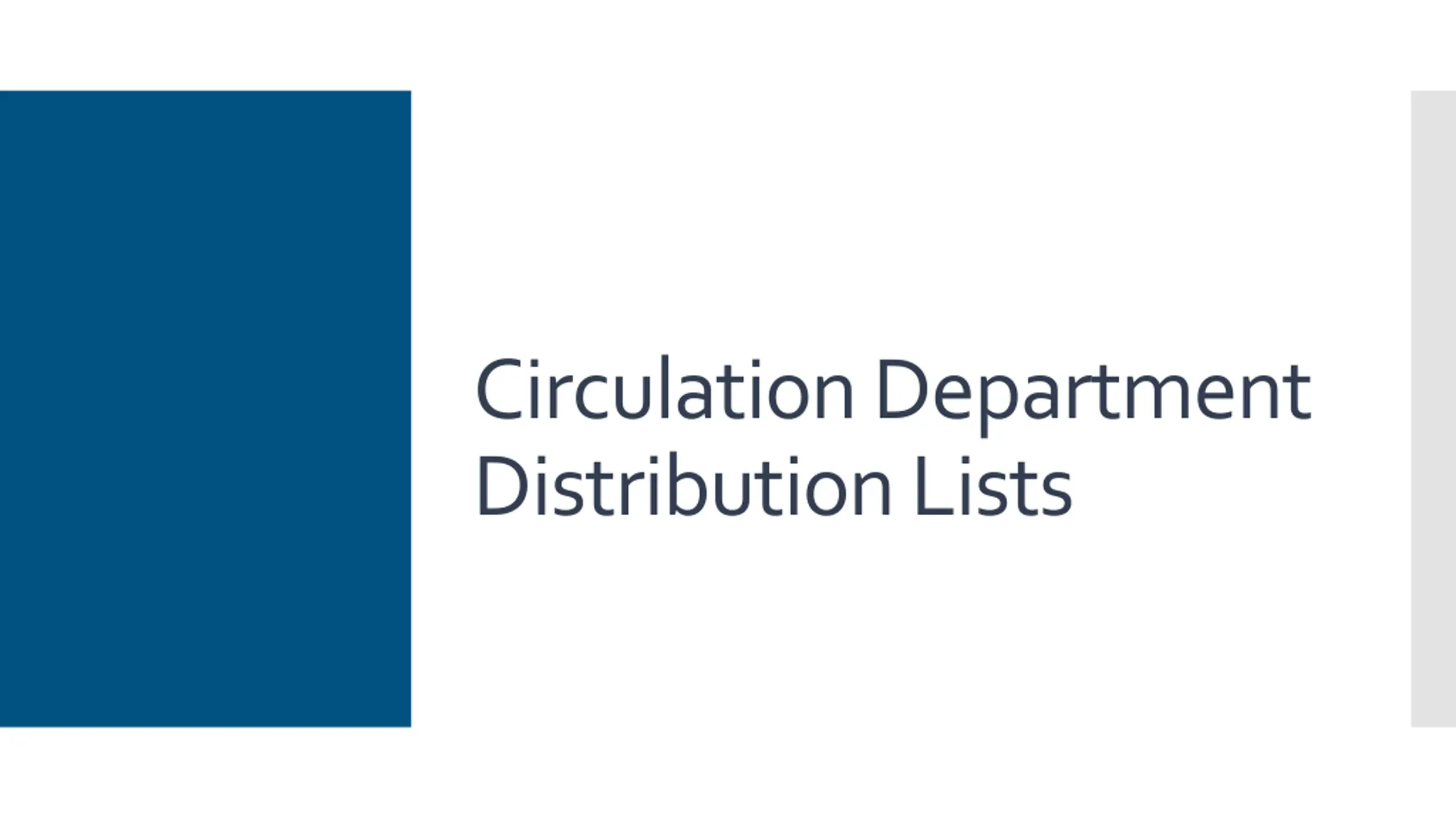 What are department distribution lists? Email address that distribute messages to selected staff at your library More effective way to communicate/ask circulation- related questions with a library than emailing individual staff Example: shelf checks, damaged items Circulation Department Distribution Lists