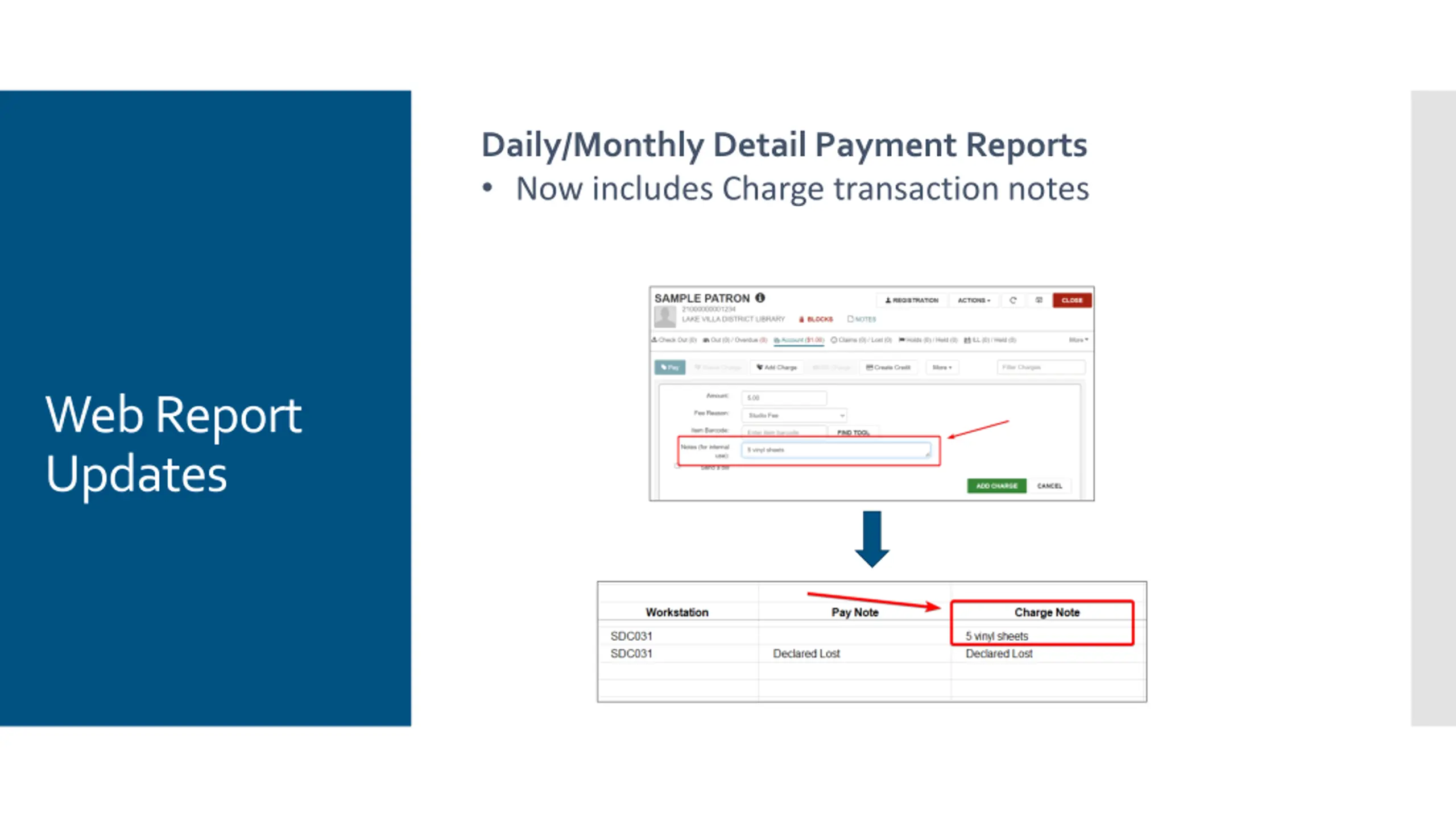 Daily/Monthly Detail Payment Reports Now includes Charge transaction notes Web Report Updates