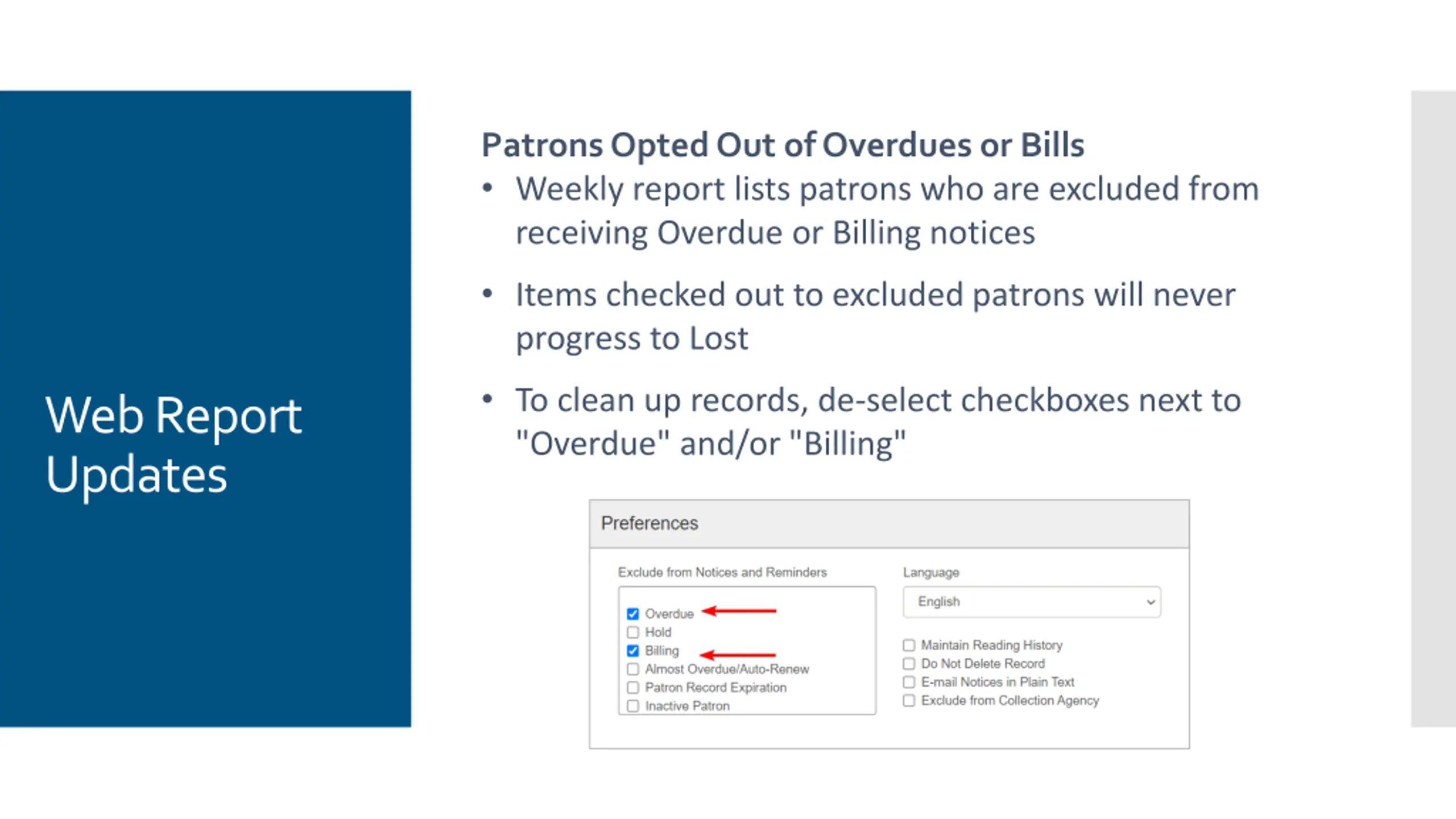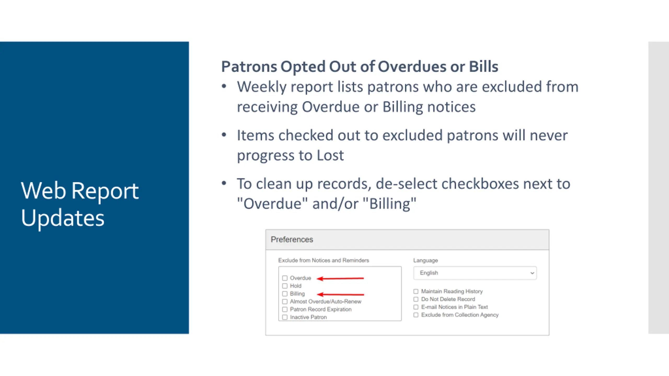 Patrons Opted Out of Overdues or Bills Weekly report lists patrons who are excluded from receiving Overdue or Billing notices Items checked out to excluded patrons will never progress to Lost To clean up records, de-select checkboxes next to "Overdue" and/or "Billing" Web Report Updates