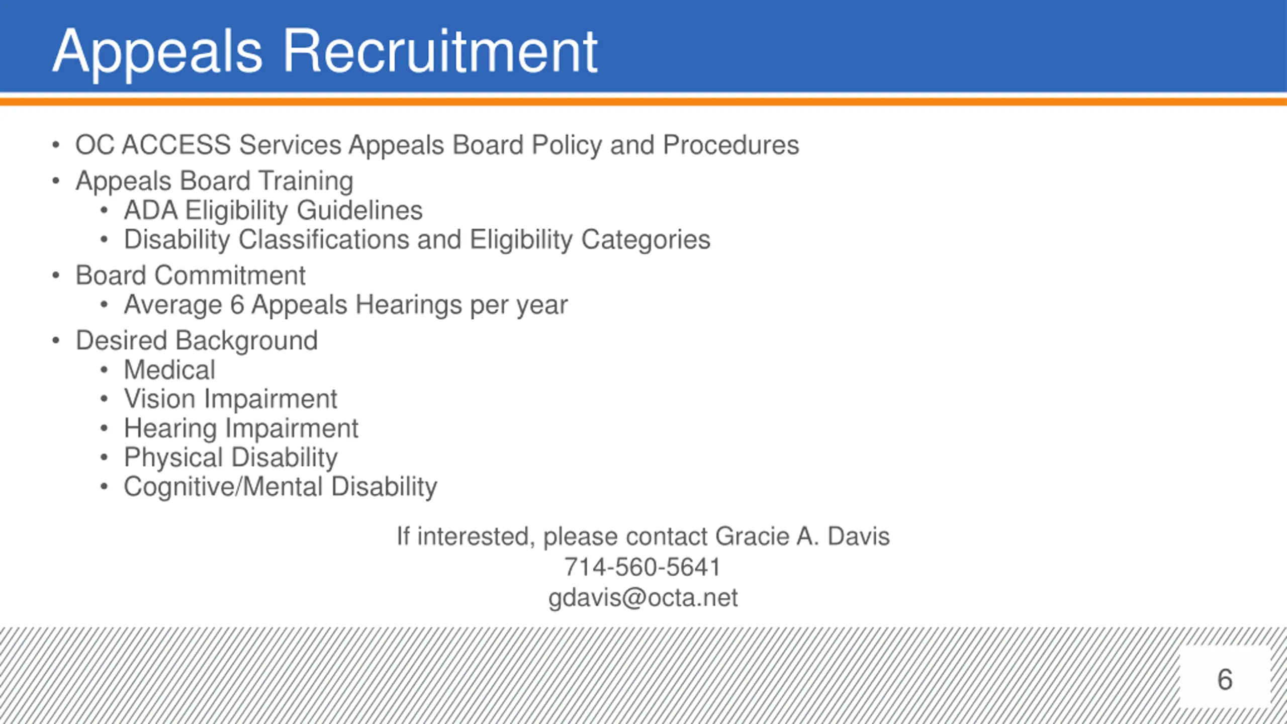Appeals Recruitment OC ACCESS Services Appeals Board Policy and Procedures Appeals Board Training ADA Eligibility Guidelines Disability Classifications and Eligibility Categories Board Commitment Average 6 Appeals Hearings per year Desired Background Medical Vision Impairment Hearing Impairment Physical Disability Cognitive/Mental Disability If interested, please contact Gracie A. Davis 714-560-5641 gdavis@octa.net 6