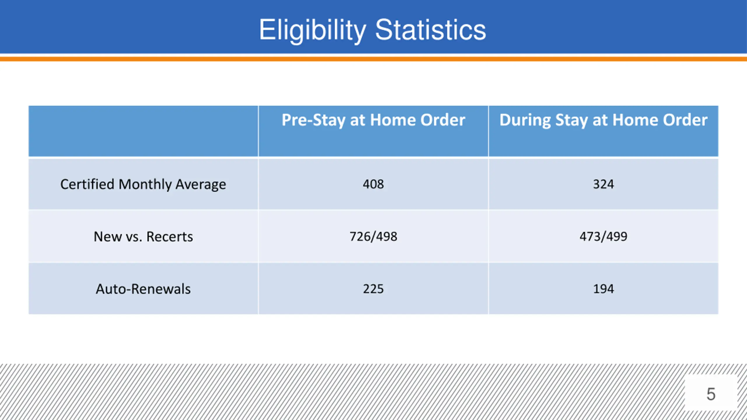 Eligibility Statistics Pre-Stay at Home Order During Stay at Home Order Certified Monthly Average 408 324 New vs. Recerts 726/498 473/499 Auto-Renewals 225 194 5