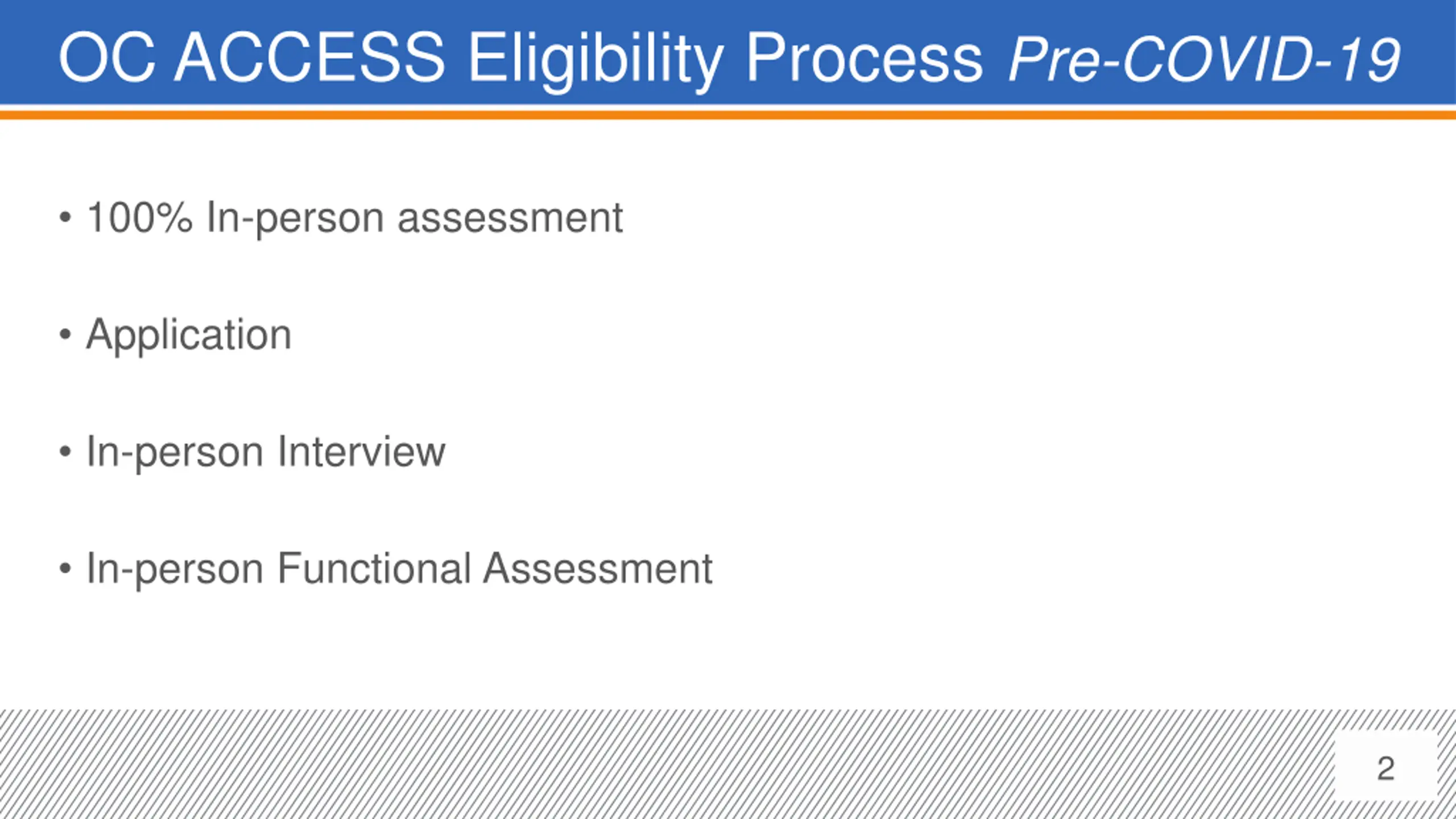 OC ACCESS Eligibility Process Pre-COVID-19 100% In-person assessment Application In-person Interview In-person Functional Assessment 2