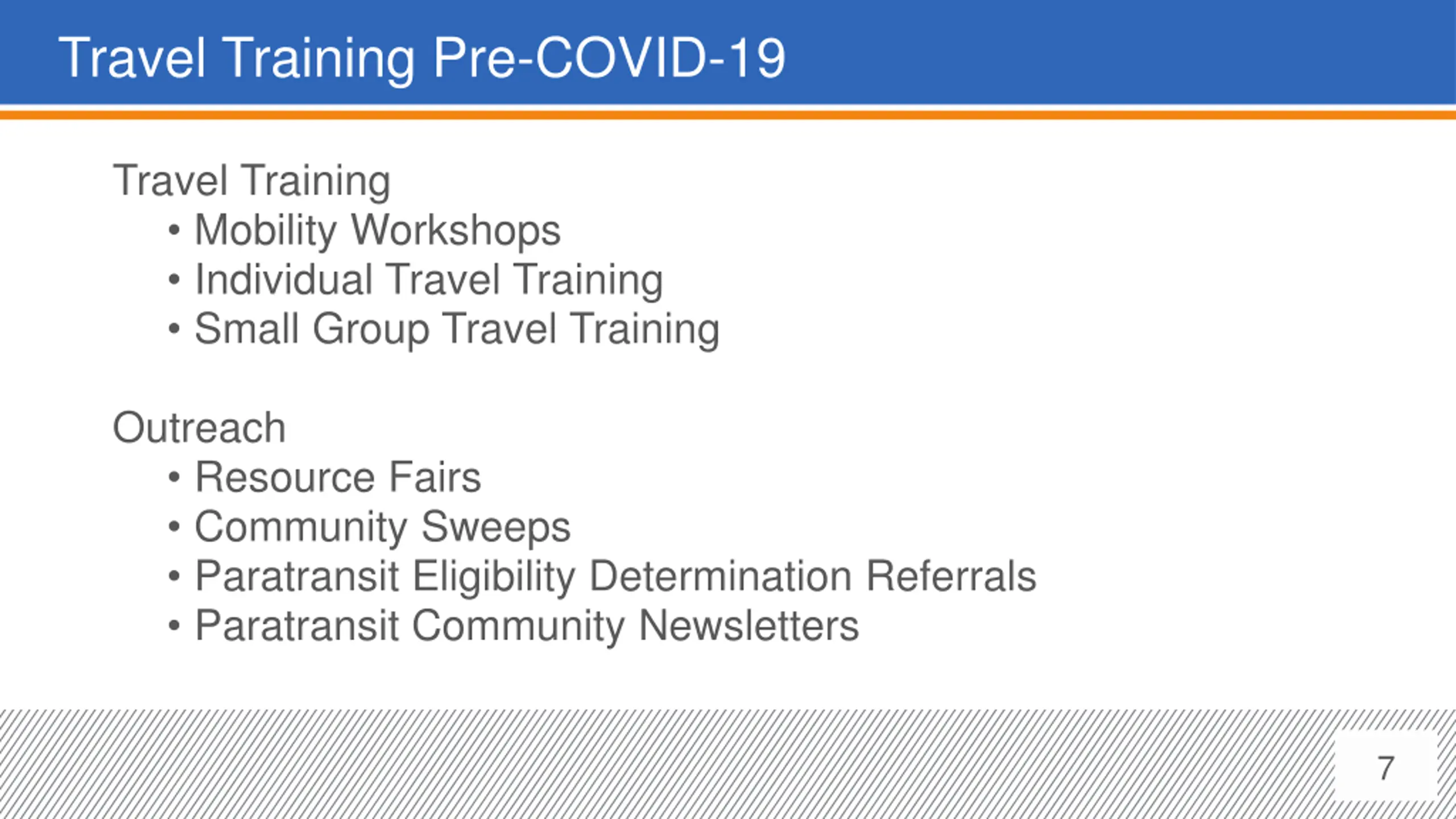 Travel Training Pre-COVID-19 Travel Training Mobility Workshops Individual Travel Training Small Group Travel Training Outreach Resource Fairs Community Sweeps Paratransit Eligibility Determination Referrals Paratransit Community Newsletters 7