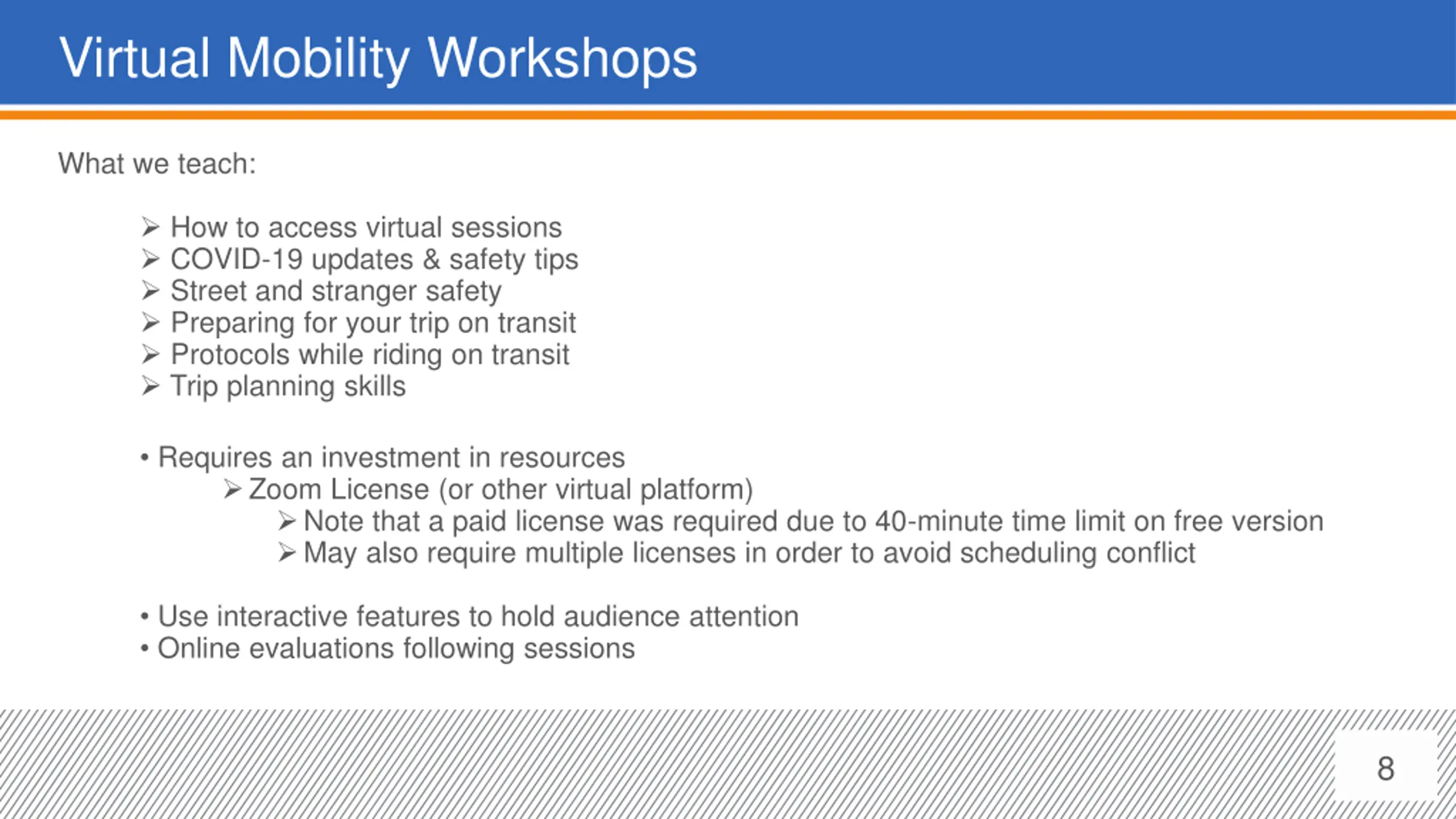 Virtual Mobility Workshops What we teach: How to access virtual sessions COVID-19 updates & safety tips Street and stranger safety Preparing for your trip on transit Protocols while riding on transit Trip planning skills Requires an investment in resources Zoom License (or other virtual platform) Note that a paid license was required due to 40-minute time limit on free version May also require multiple licenses in order to avoid scheduling conflict Use interactive features to hold audience attention Online evaluations following sessions 8