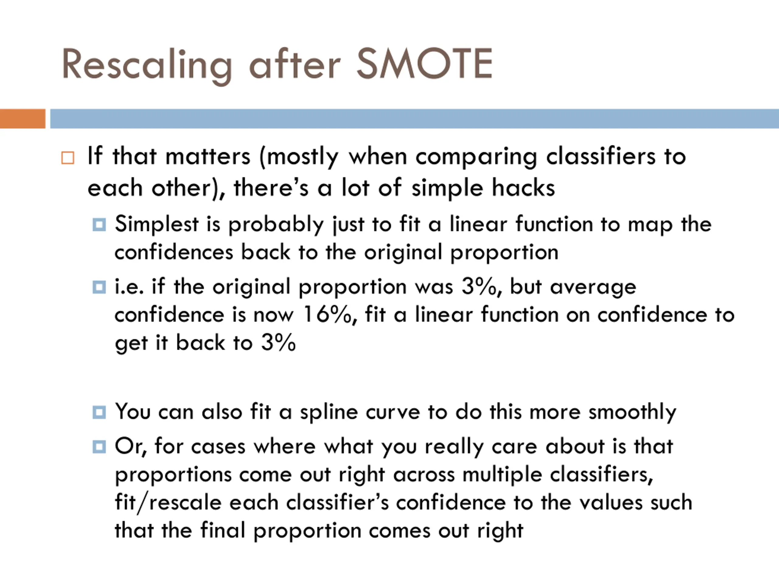 Rescaling after SMOTE If that matters (mostly when comparing classifiers to each other), there s a lot of simple hacks Simplest is probably just to fit a linear function to map the confidences back to the original proportion i.e. if the original proportion was 3%, but average confidence is now 16%, fit a linear function on confidence to get it back to 3% You can also fit a spline curve to do this more smoothly Or, for cases where what you really care about is that proportions come out right across multiple classifiers, fit/rescale each classifier s confidence to the values such that the final proportion comes out right
