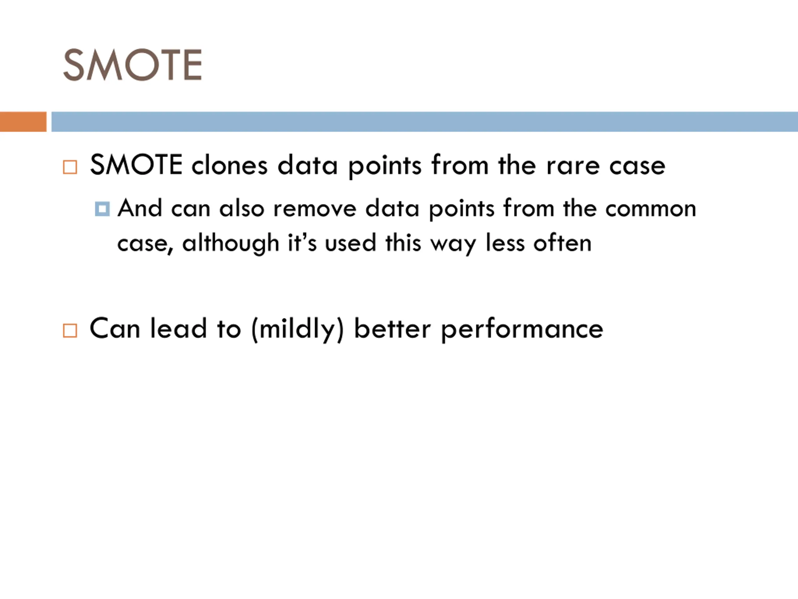 SMOTE SMOTE clones data points from the rare case And can also remove data points from the common case, although it s used this way less often Can lead to (mildly) better performance