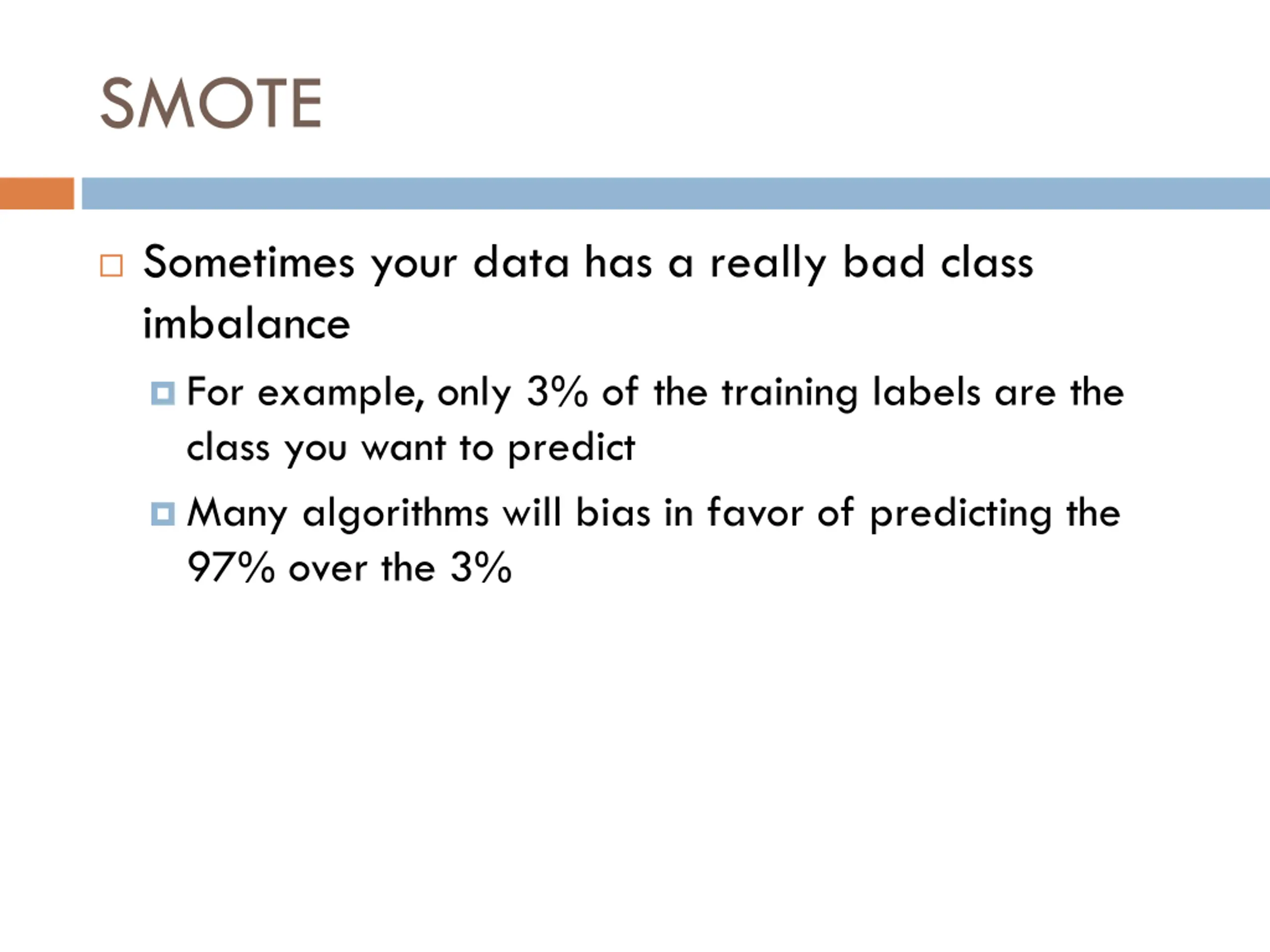 SMOTE Sometimes your data has a really bad class imbalance For example, only 3% of the training labels are the class you want to predict Many algorithms will bias in favor of predicting the 97% over the 3%