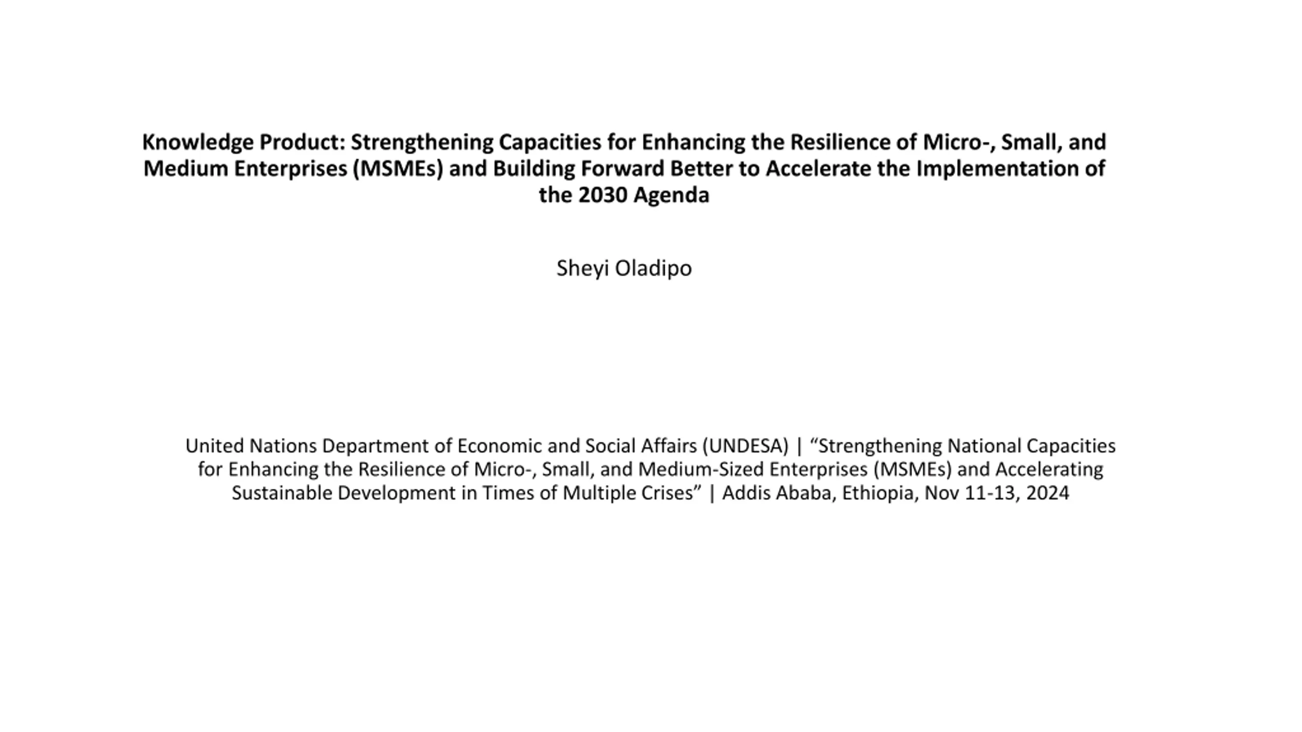 Knowledge Product: Strengthening Capacities for Enhancing the Resilience of Micro-, Small, and Medium Enterprises (MSMEs) and Building Forward Better to Accelerate the Implementation of the 2030 Agenda Sheyi Oladipo United Nations Department of Economic and Social Affairs (UNDESA) | Strengthening National Capacities for Enhancing the Resilience of Micro-, Small, and Medium-Sized Enterprises (MSMEs) and Accelerating Sustainable Development in Times of Multiple Crises | Addis Ababa, Ethiopia, Nov 11-13, 2024
