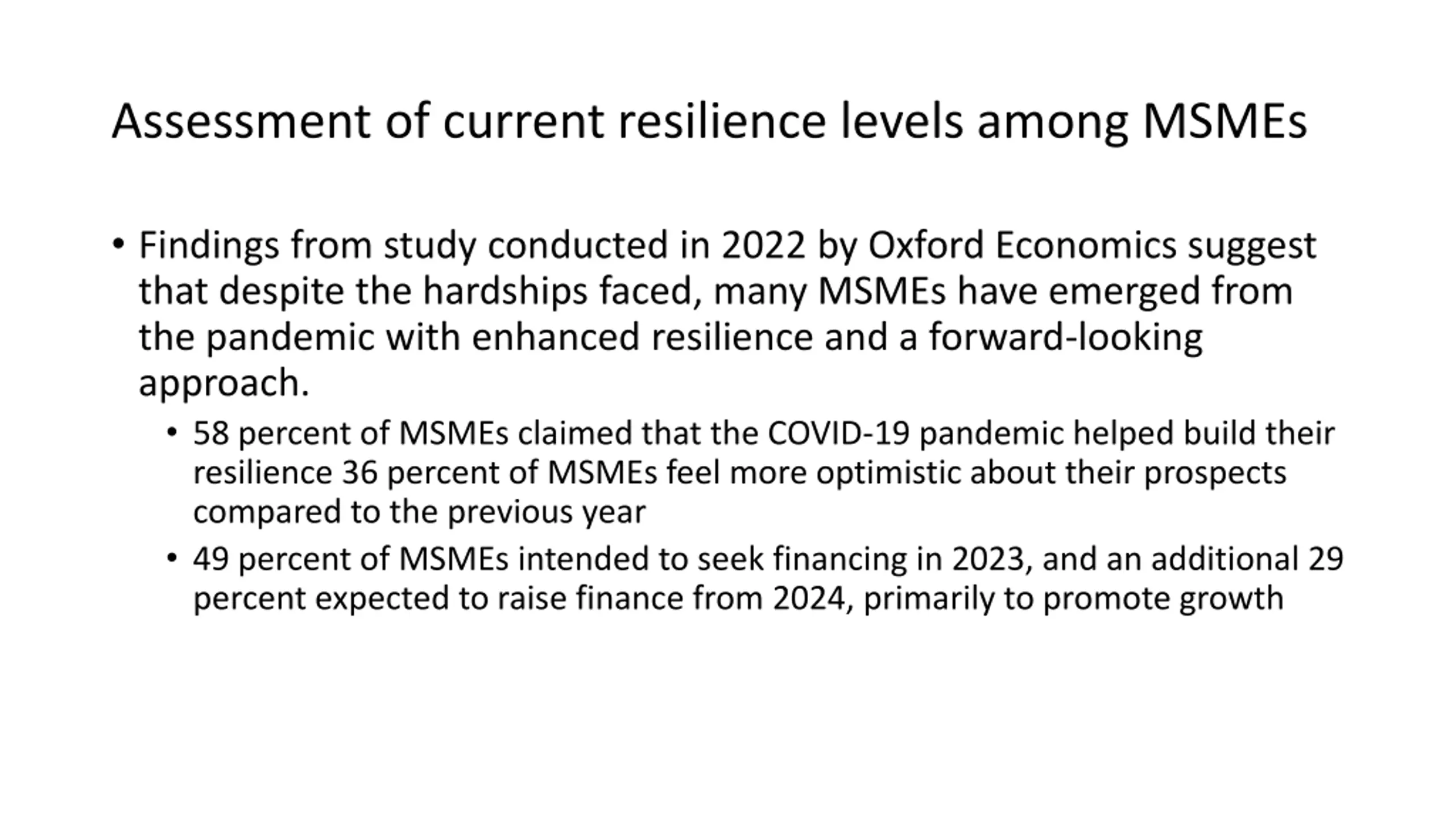 Assessment of current resilience levels among MSMEs Findings from study conducted in 2022 by Oxford Economics suggest that despite the hardships faced, many MSMEs have emerged from the pandemic with enhanced resilience and a forward-looking approach. 58 percent of MSMEs claimed that the COVID-19 pandemic helped build their resilience 36 percent of MSMEs feel more optimistic about their prospects compared to the previous year 49 percent of MSMEs intended to seek financing in 2023, and an additional 29 percent expected to raise finance from 2024, primarily to promote growth