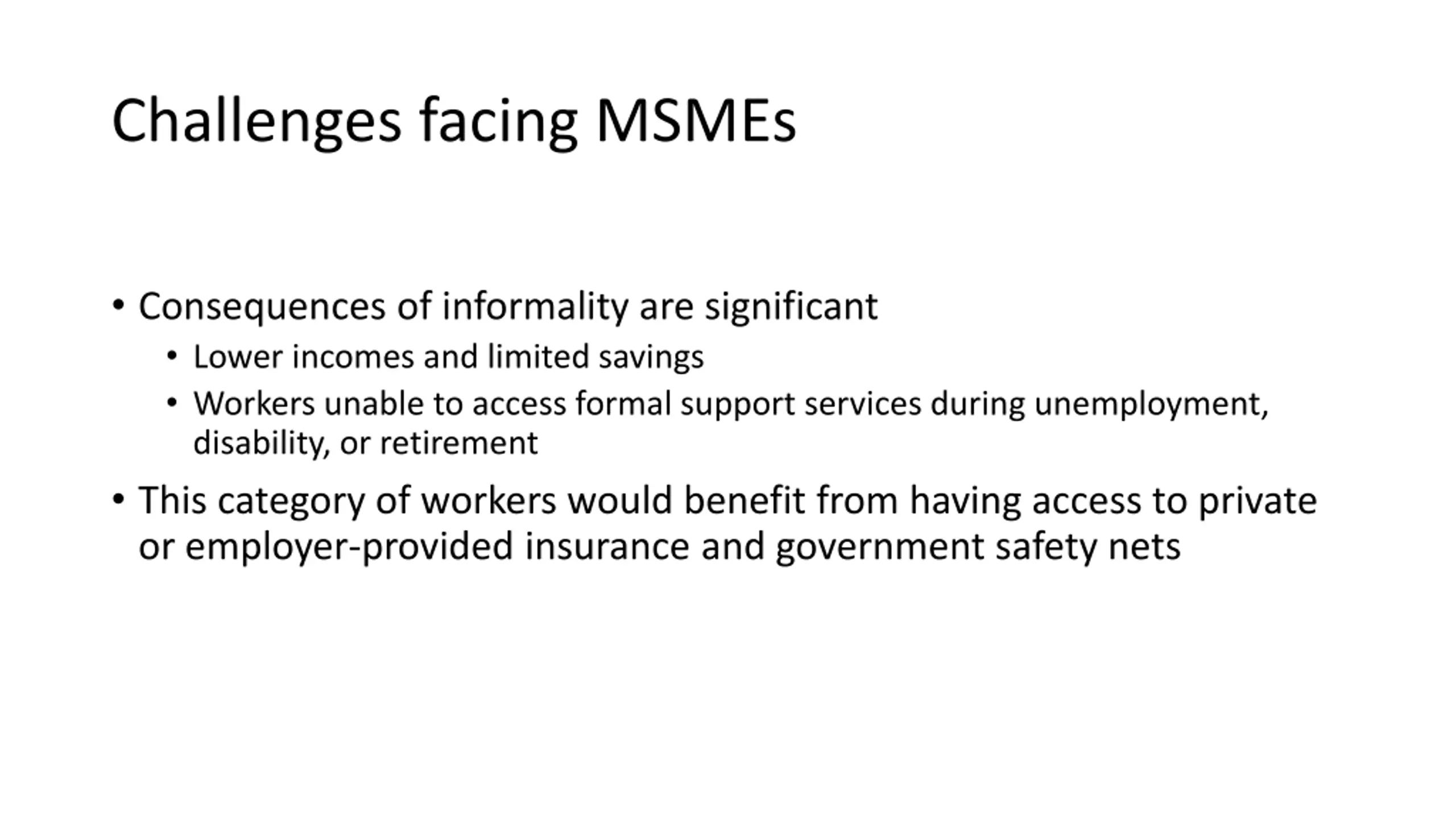 Challenges facing MSMEs Consequences of informality are significant Lower incomes and limited savings Workers unable to access formal support services during unemployment, disability, or retirement This category of workers would benefit from having access to private or employer-provided insurance and government safety nets