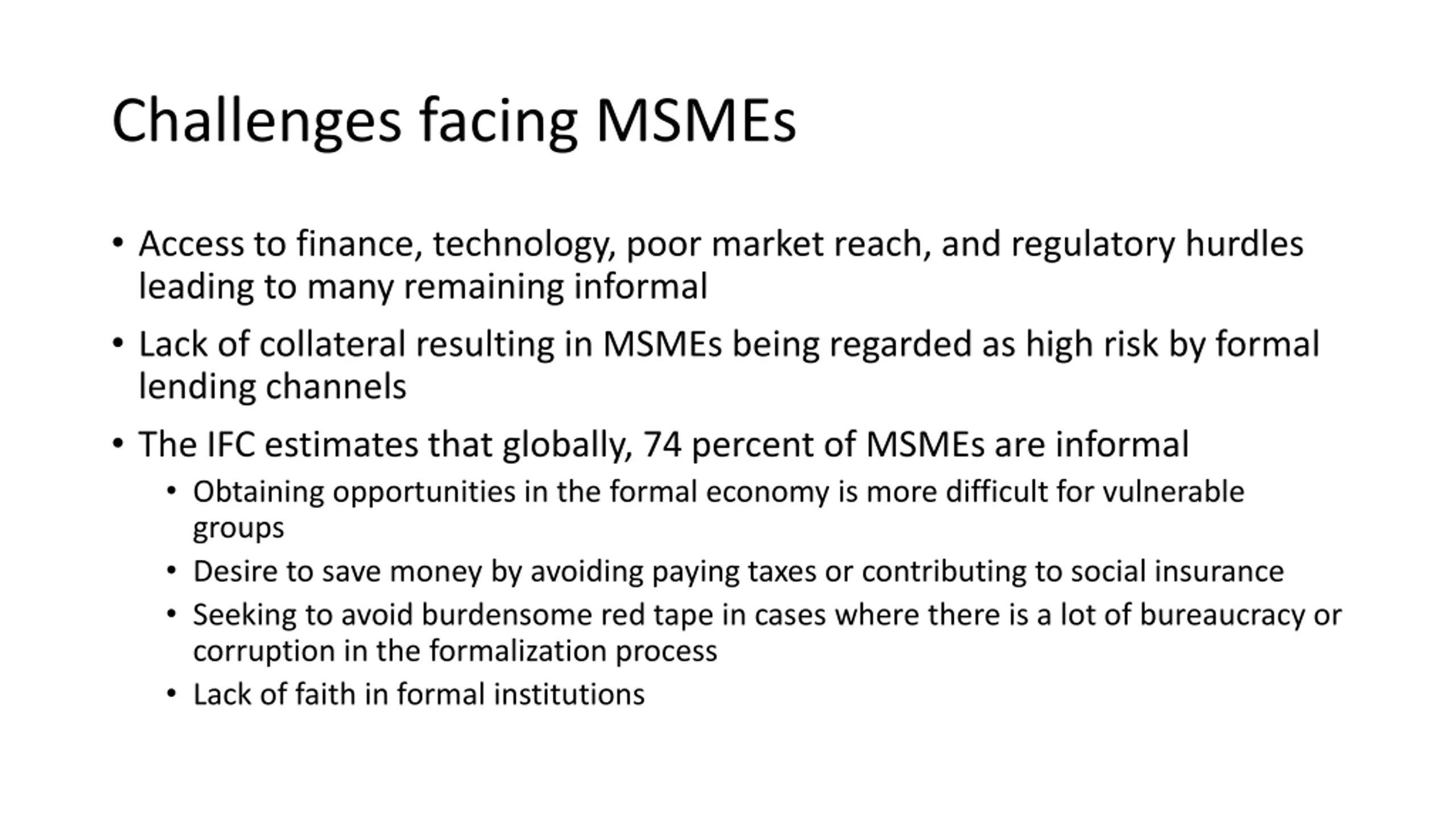 Challenges facing MSMEs Access to finance, technology, poor market reach, and regulatory hurdles leading to many remaining informal Lack of collateral resulting in MSMEs being regarded as high risk by formal lending channels The IFC estimates that globally, 74 percent of MSMEs are informal Obtaining opportunities in the formal economy is more difficult for vulnerable groups Desire to save money by avoiding paying taxes or contributing to social insurance Seeking to avoid burdensome red tape in cases where there is a lot of bureaucracy or corruption in the formalization process Lack of faith in formal institutions