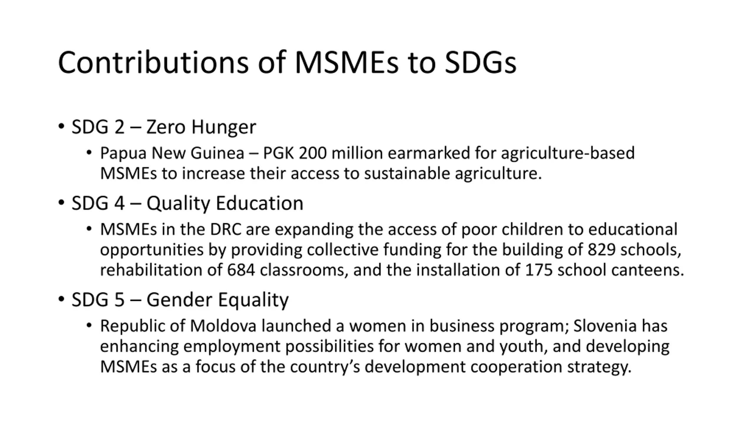 Contributions of MSMEs to SDGs SDG 2 Zero Hunger Papua New Guinea PGK 200 million earmarked for agriculture-based MSMEs to increase their access to sustainable agriculture. SDG 4 Quality Education MSMEs in the DRC are expanding the access of poor children to educational opportunities by providing collective funding for the building of 829 schools, rehabilitation of 684 classrooms, and the installation of 175 school canteens. SDG 5 Gender Equality Republic of Moldova launched a women in business program; Slovenia has enhancing employment possibilities for women and youth, and developing MSMEs as a focus of the country s development cooperation strategy.